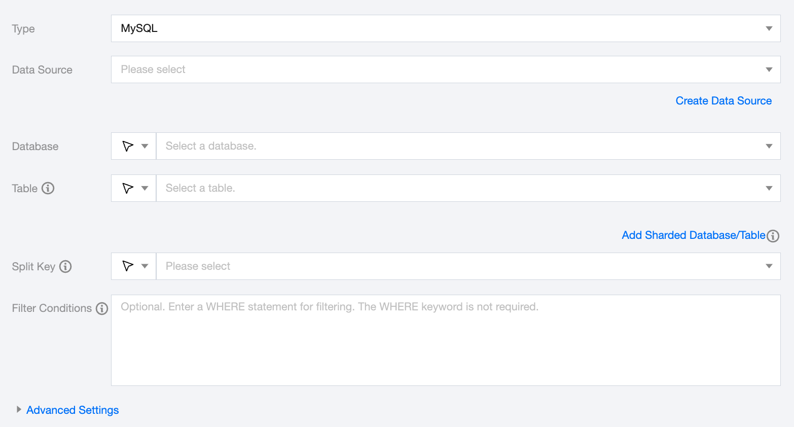 Split Key | Specify the field used for data sharding. After specifying, concurrent tasks will be initiated for data synchronization, improving data synchronization efficiency. You can use a column in the source data table as the partition key. It is recommended to use the primary key or indexed columns as the partition key. Only integer-type fields are supported. |