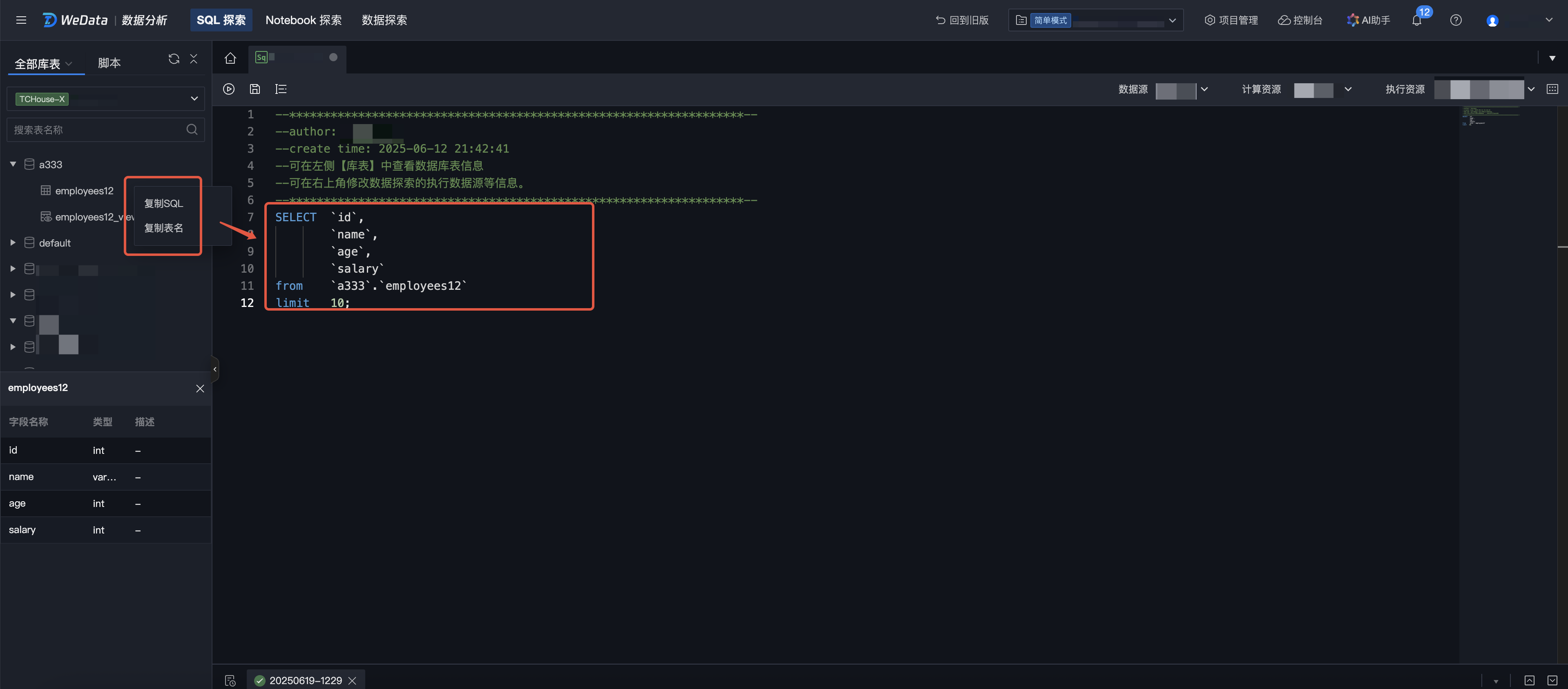 1. In the directory on the left, select a data table, click More > Copy SQL > Copy table name to copy the query statement and table name of the data table.
