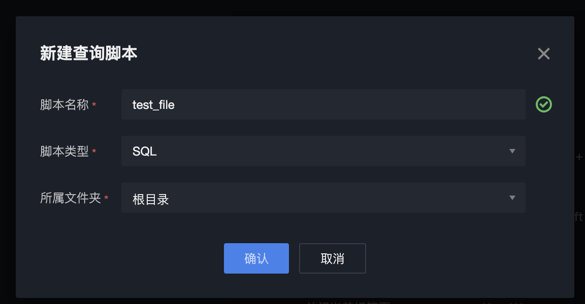 Fill in the script name, select the script type and folder, then click OK to create the instance successfully.
