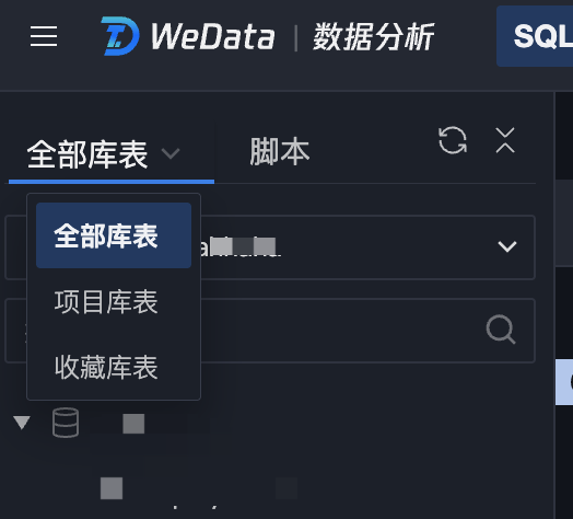 Database tables support filtering through three ways: all databases and tables, project database table, and favorite.