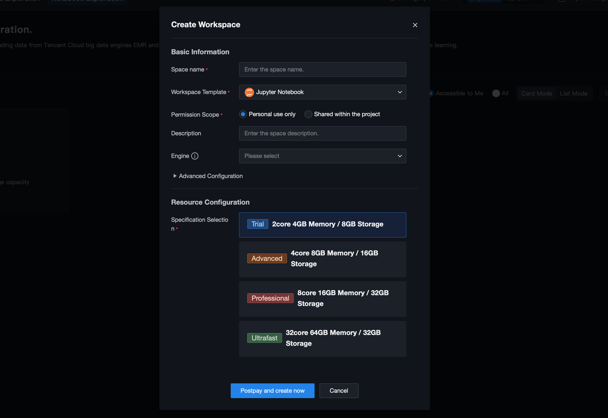 Permission Scope | If “Personal use only” is selected, only the current user can access the workspace. If “Shared within the project” is selected, project members can enter the workspace for collaborative development. | Yes |