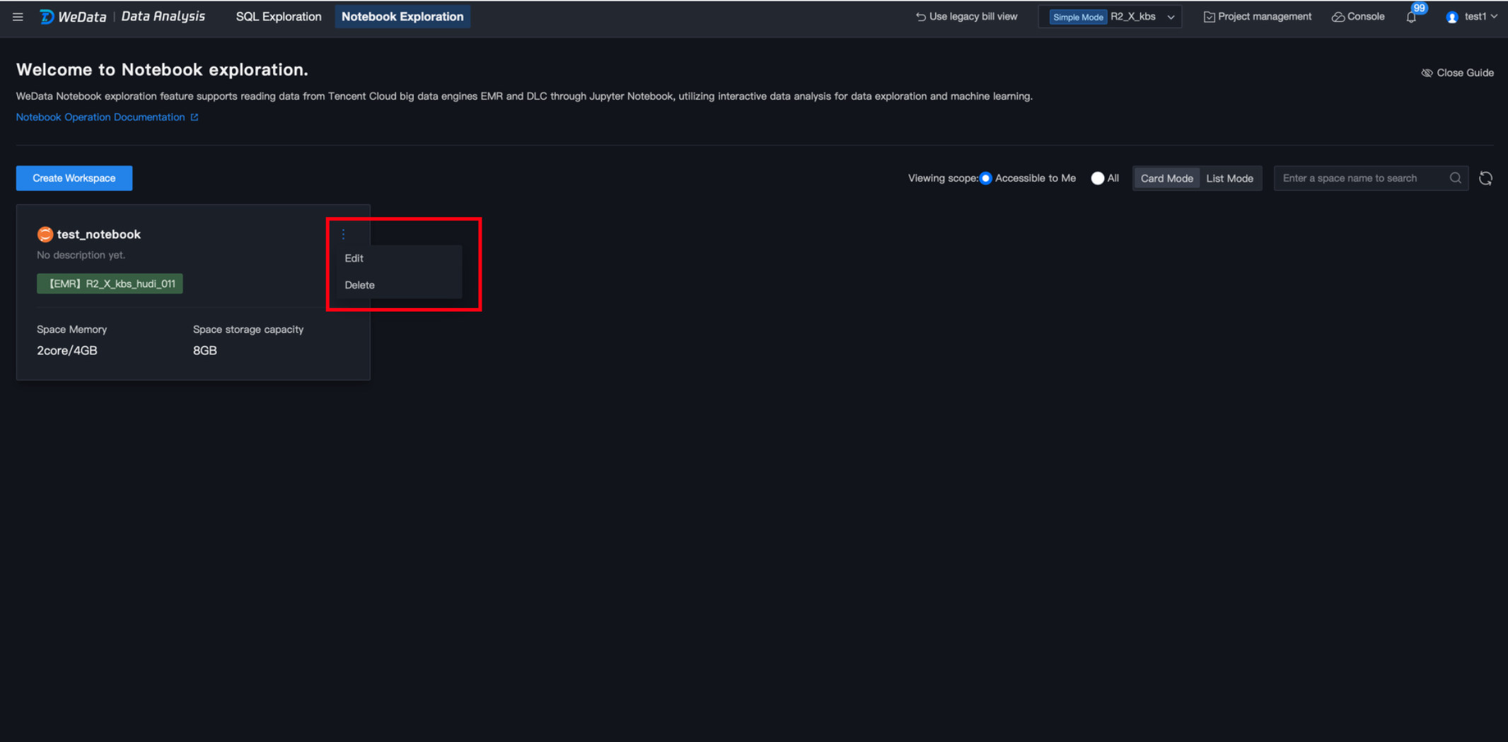 5. Enter the Notebook Exploration list page and click Create Workspace.