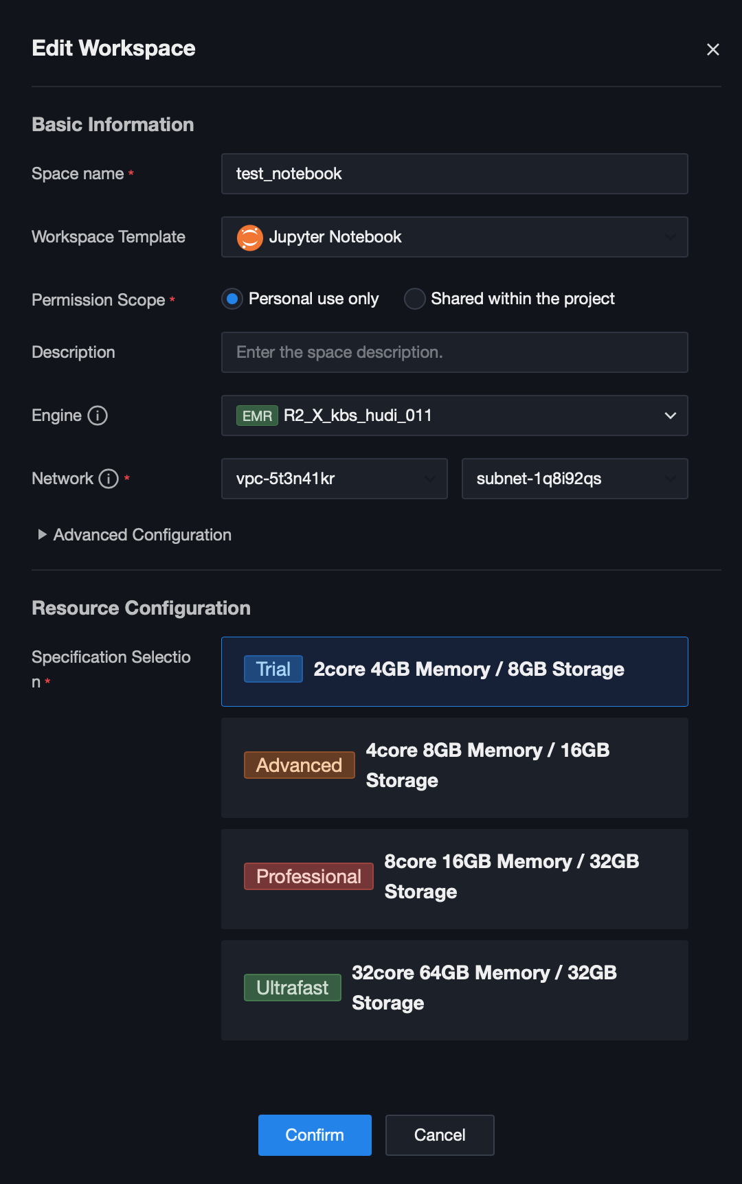 Space Name | Name of the Notebook workspace. Supports Chinese, English, numbers, underscores (_), and hyphens (-), with a maximum length of 32 characters. | Yes |