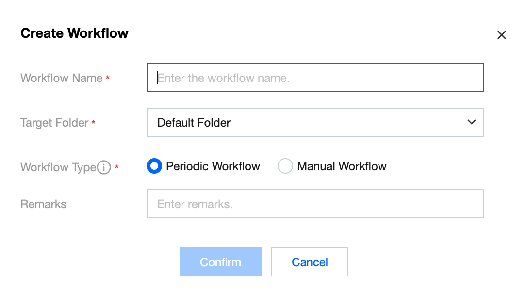 2. In the pop-up window for creating a new workflow, enter the workflow name, select the target folder, and click Confirm.