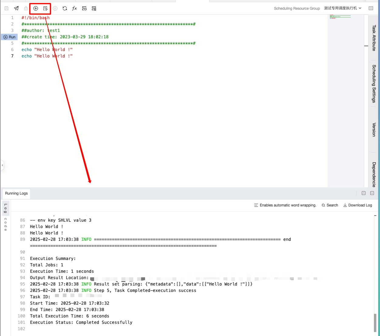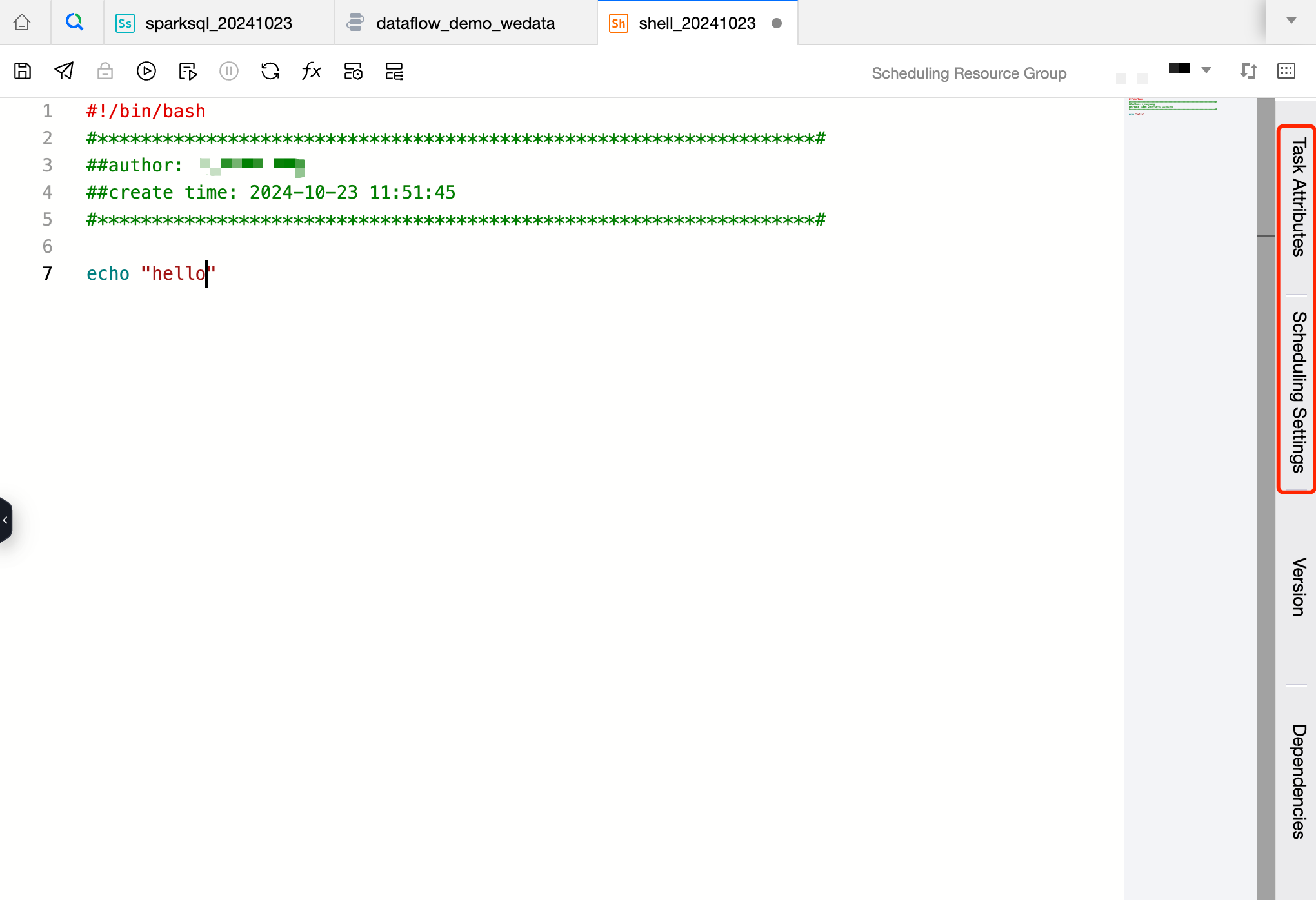 2. Configure task attributes and scheduling policies. Click Task Attributes and Scheduling Settings on the right side of the task, and configure the basic information and scheduling information of the task in the panel.