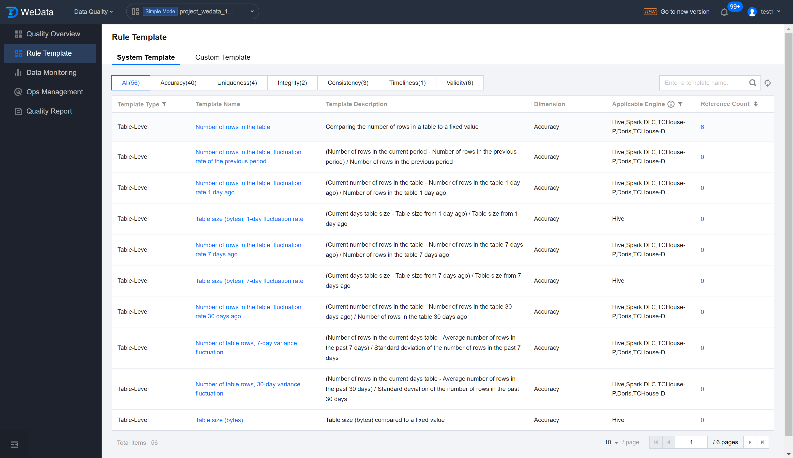 Rule Dimension | - | The rule dimension is designed to calculate the quality score and reflect the quality proportion of different types of rules. There are six built-in rule dimensions in the system: Accuracy, Uniqueness, Integrity, Consistency, Timeliness, and Validity. |