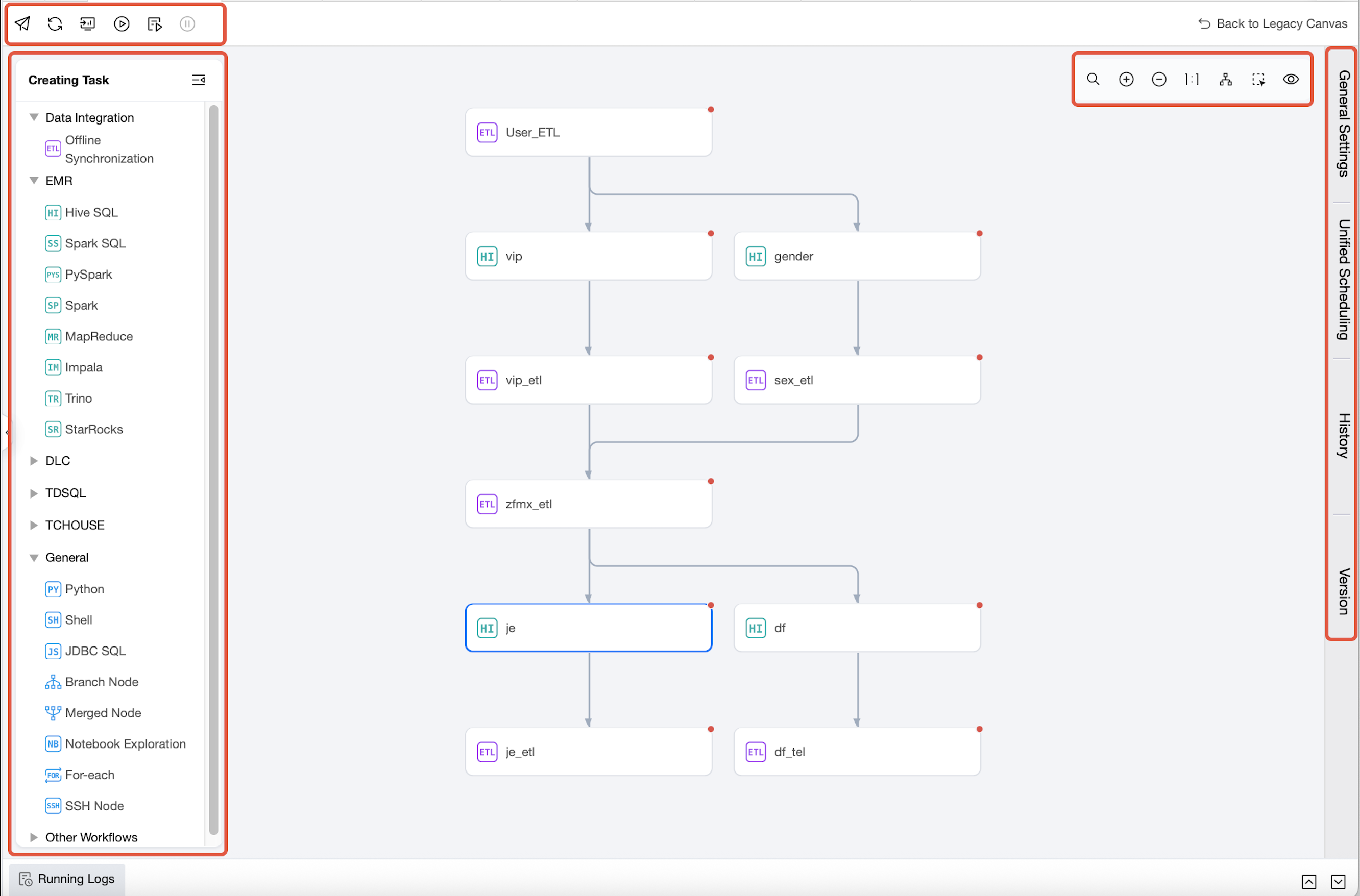 Task Type Directory | In the Task Type Directory, click the computing task type to add a task node to the workflow canvas. |
