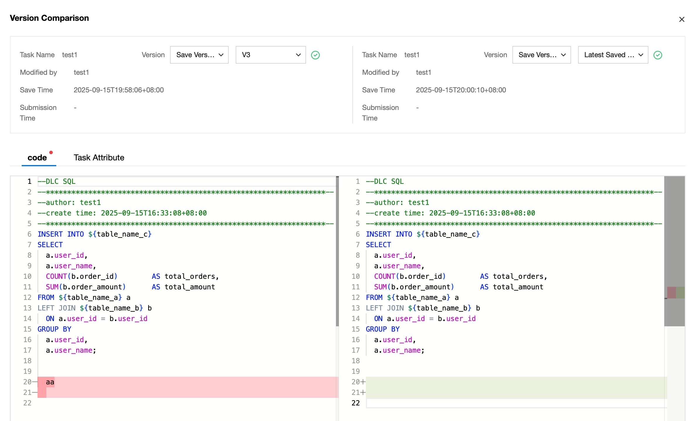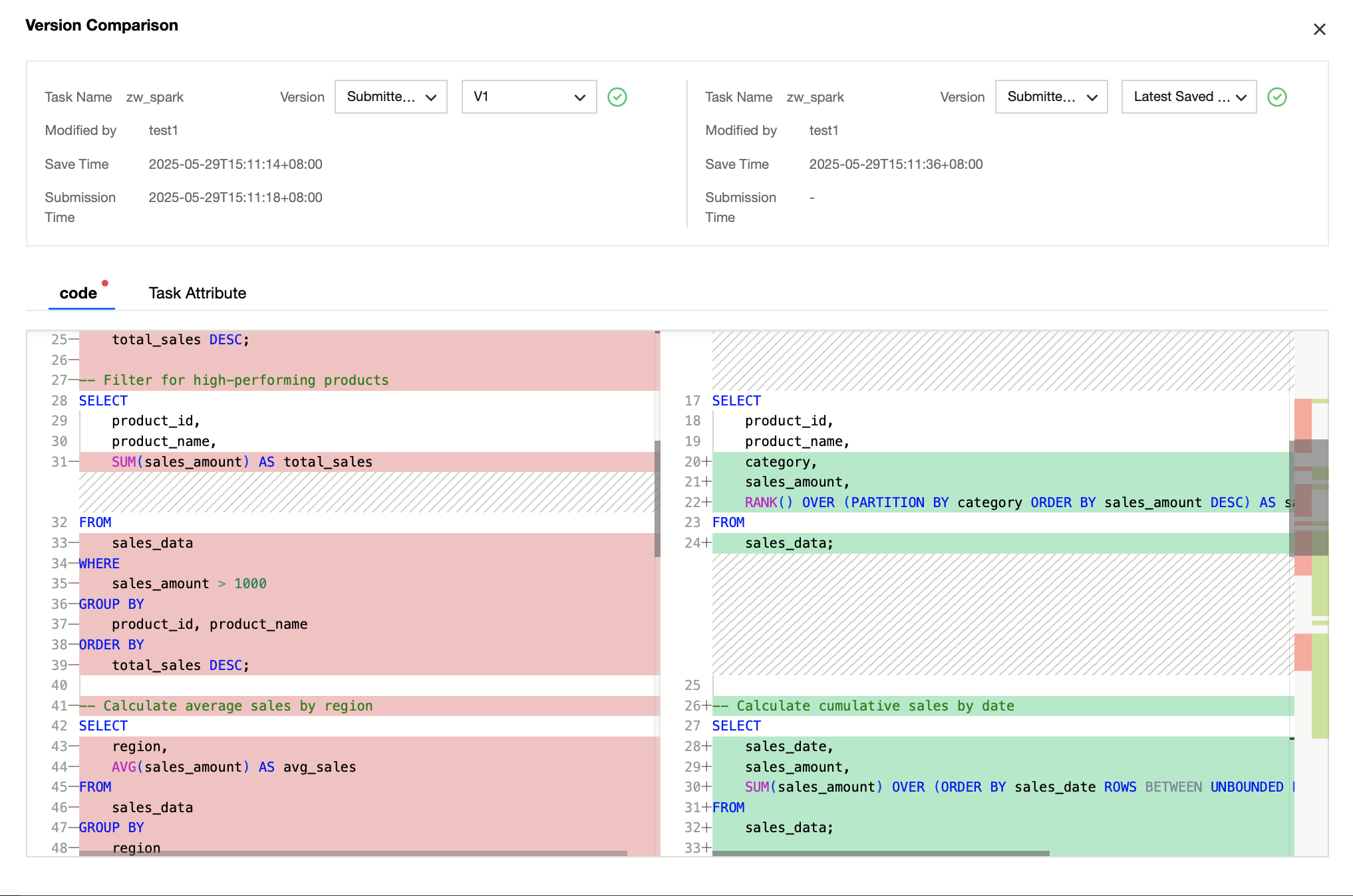 Compare | Provide pairwise comparison between historical versions of compute tasks, showing key information differences through code comparison panel and task properties panel. |