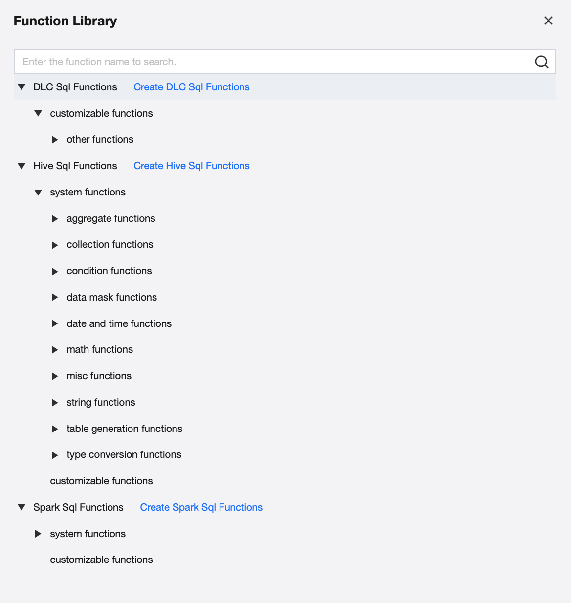 A function library is provided, containing commonly used functions and algorithms for Hive SQL, Spark SQL, and DLC, such as mathematical functions, data transformation functions, and aggregation functions. It also supports user-defined functions (UDFs), helping users perform flexible and powerful data processing and computation.