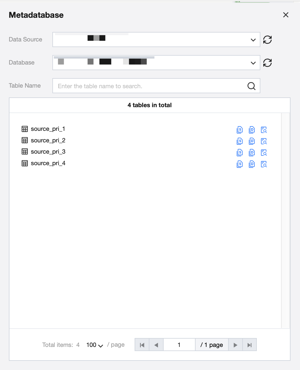 Display metadata information of accessed data sources in the current project. You can obtain database table information by retrieving data sources, databases, or data tables, facilitating quick usage during task development. It provides quick functions like copy table, query SQL, table DDL, and table name.