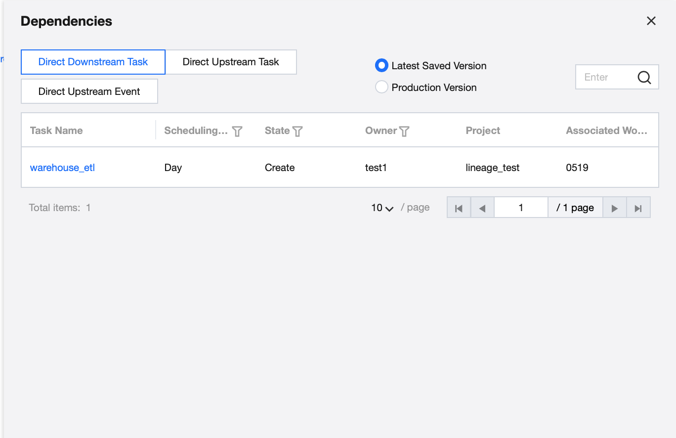 On canvas, after connecting task nodes or adding event dependency in scheduling setting, the dependency relationship will display specific dependencies. Selecting the production version option shows dependencies in the submitted run version, while selecting the latest saved version shows dependencies from the last save. Tasks support search and can be filtered by scheduling cycle, status, and owner. Events can be filtered by period type and validity time.