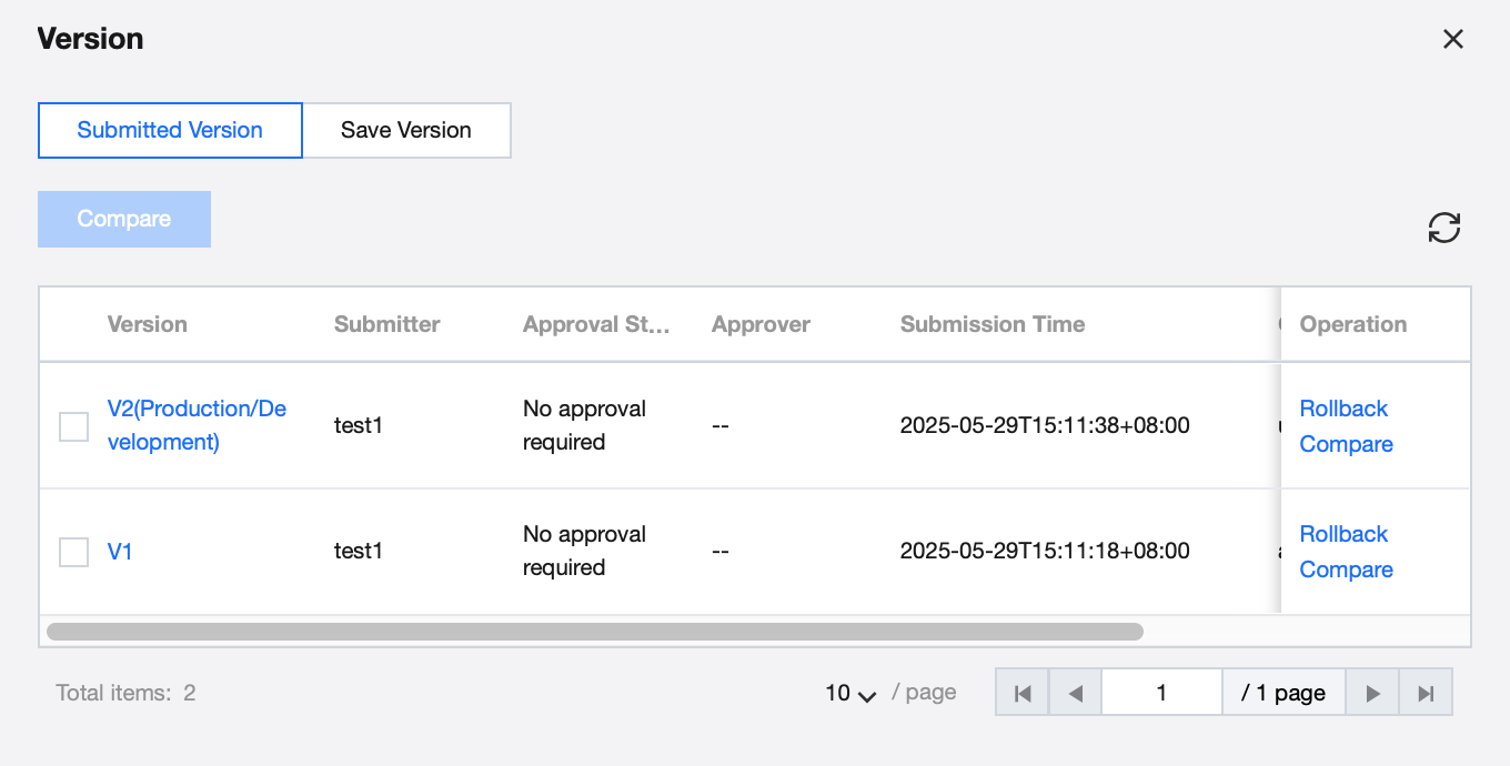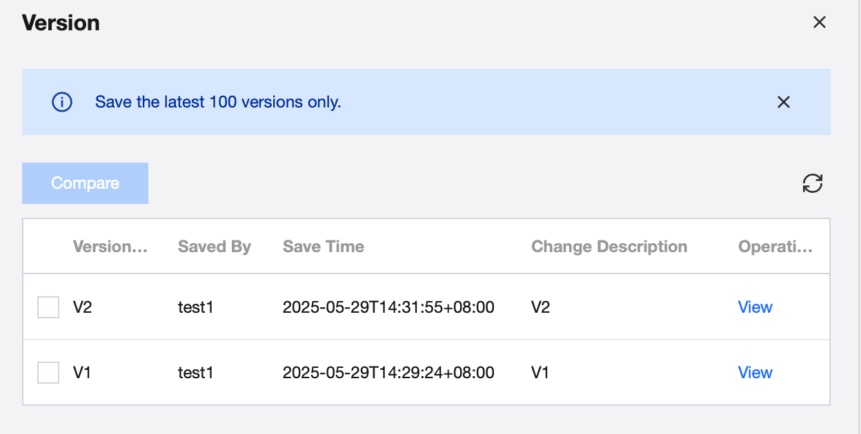The task history shows submission/save records. You can view node historical versions, submitter/saver, submission time/save time, change type, status, remarks, etc. in the version panel. Click the version name to view a single version's information and compare two versions by selecting them. After submission, a submit version is generated. Each save creates a save version, and a new record appears in the submit version/save version panel. Only submitted task nodes have version information; otherwise, it remains empty.