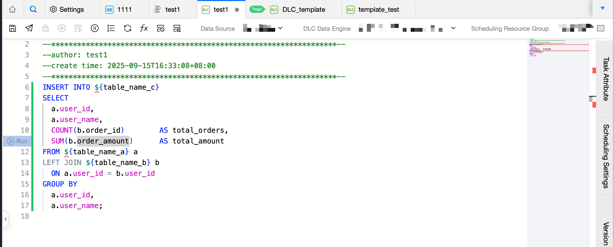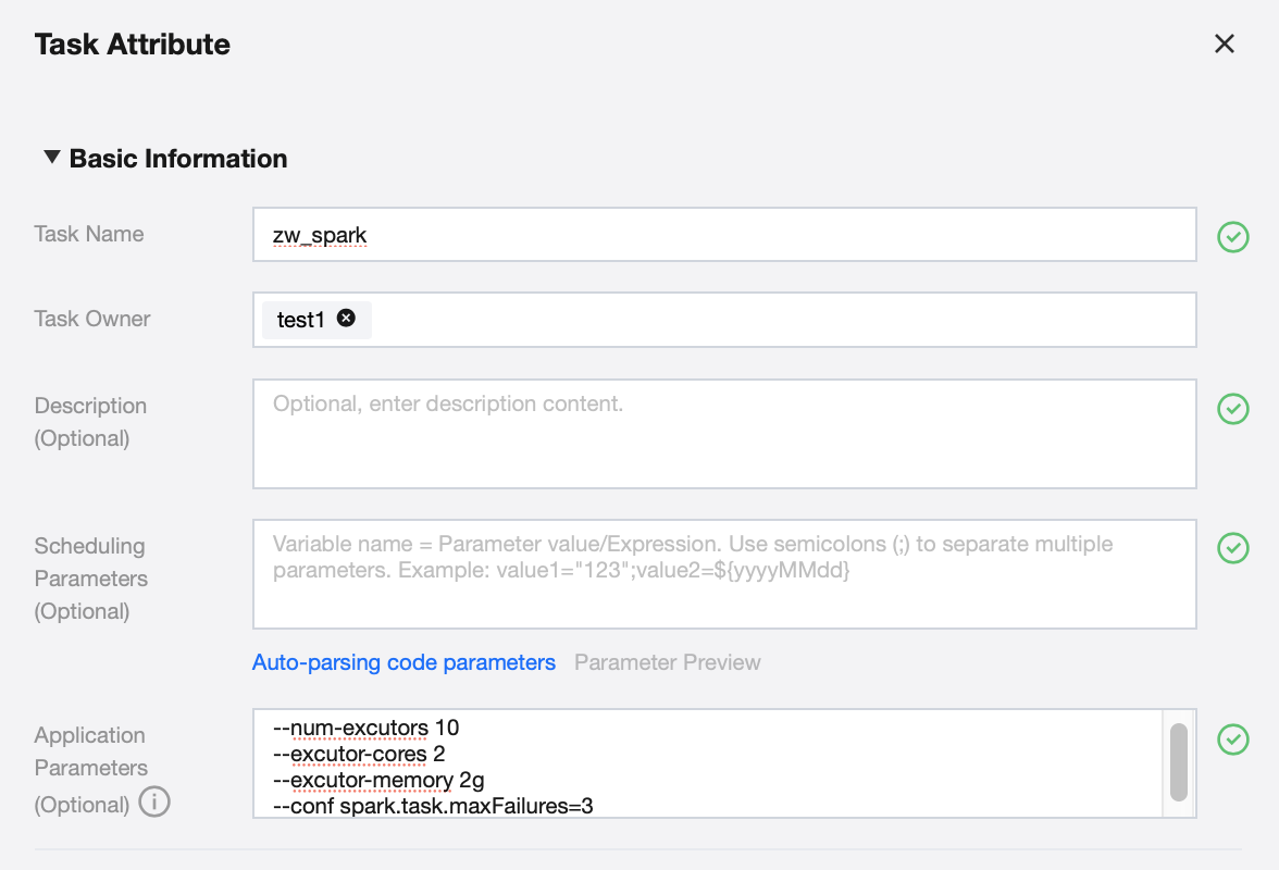 The task name, task owner, task description, and task scheduling parameters of the current task can be modified. Application parameters are supported, and automatic code variable parsing is provided. A parameter description document is available to assist with scheduling parameter usage.