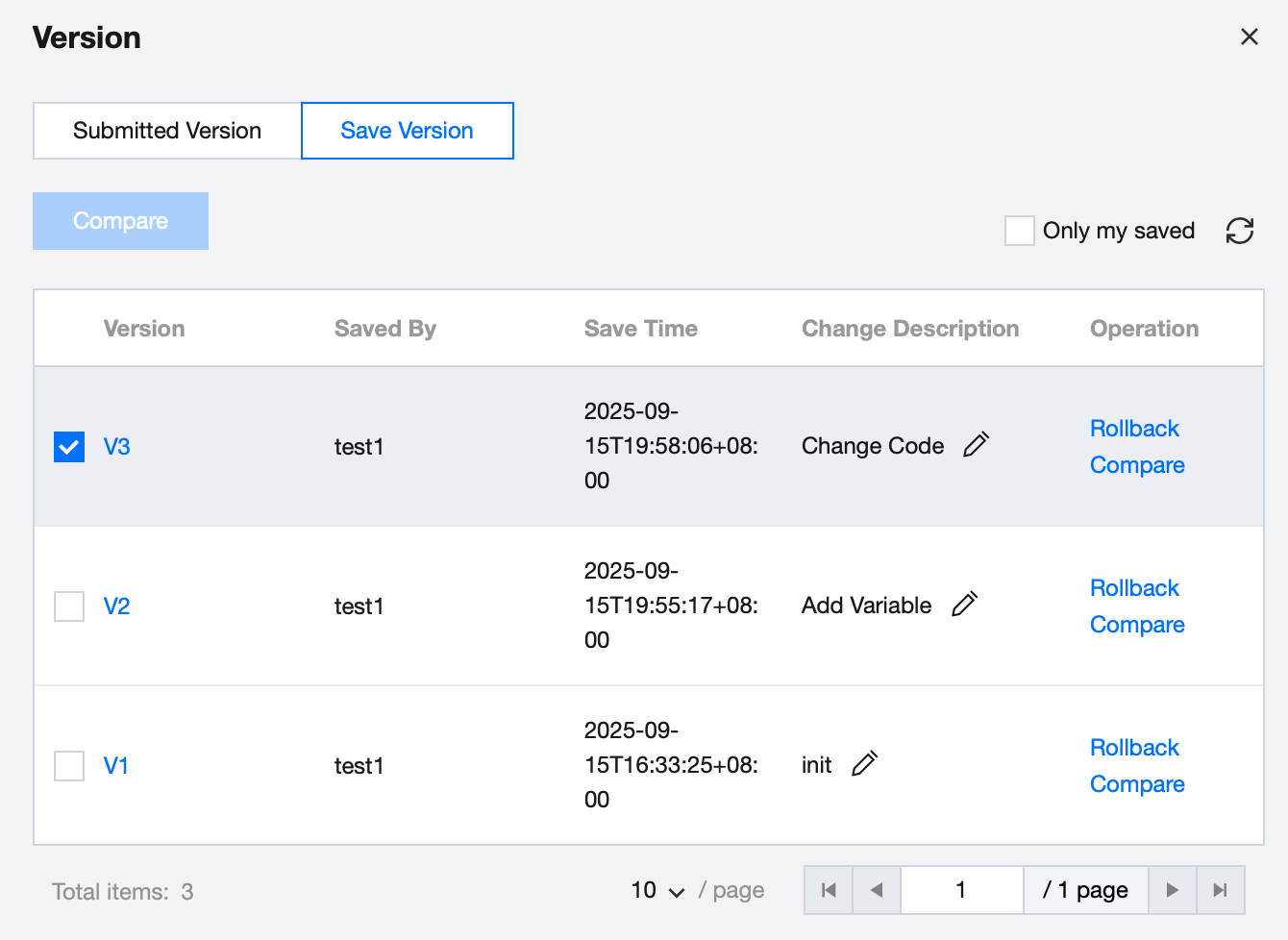Change Description | Click the pencil icon in the change description to add or modify the description for this specific version. |
