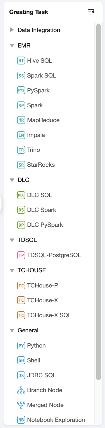 The orchestration space provides workflow orchestration and configuration capabilities, allowing users to organize and develop different types of task code and submit them to the scheduling system for periodic execution. A project can contain multiple workflows, and WeData supports grouping workflows into the same folder for efficient management. A workflow is a collection of various task objects, including: Data integration tasks, Computation tasks (Hive SQL, JDBC SQL, MapReduce, PySpark, Python, Shell, Spark, Spark SQL, DLC SQL, DLC Spark, Impala, TCHouse-P, Trino), General tasks.
