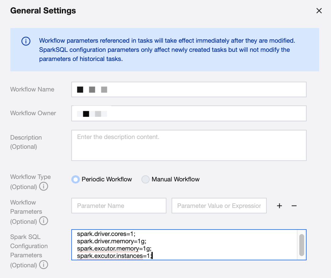 Click General Settings on the right to edit the current workflow name, responsible person, add description, workflow variables, and Spark SQL configuration parameters (optional). Among them, Spark SQL configuration only takes effect for Spark SQL tasks in workflow tasks.