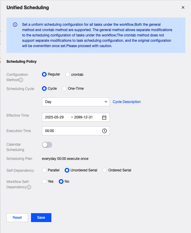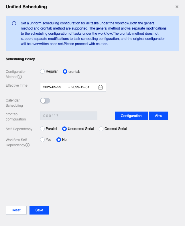 Workflow scheduling supports two types of periodic scheduling configurations: regular and crontab. Regular configuration: Includes one-time, minute, hour, day, week, month, and year scheduling options, as described in the scheduling settings. Crontab configuration: More flexible, but can only be configured within unified workflow scheduling. All tasks under a crontab configuration must share the same scheduling time (crontab expression). Cross-workflow task dependencies are not supported, nor is creating dependencies between tasks configured with crontab and those configured with regular scheduling.