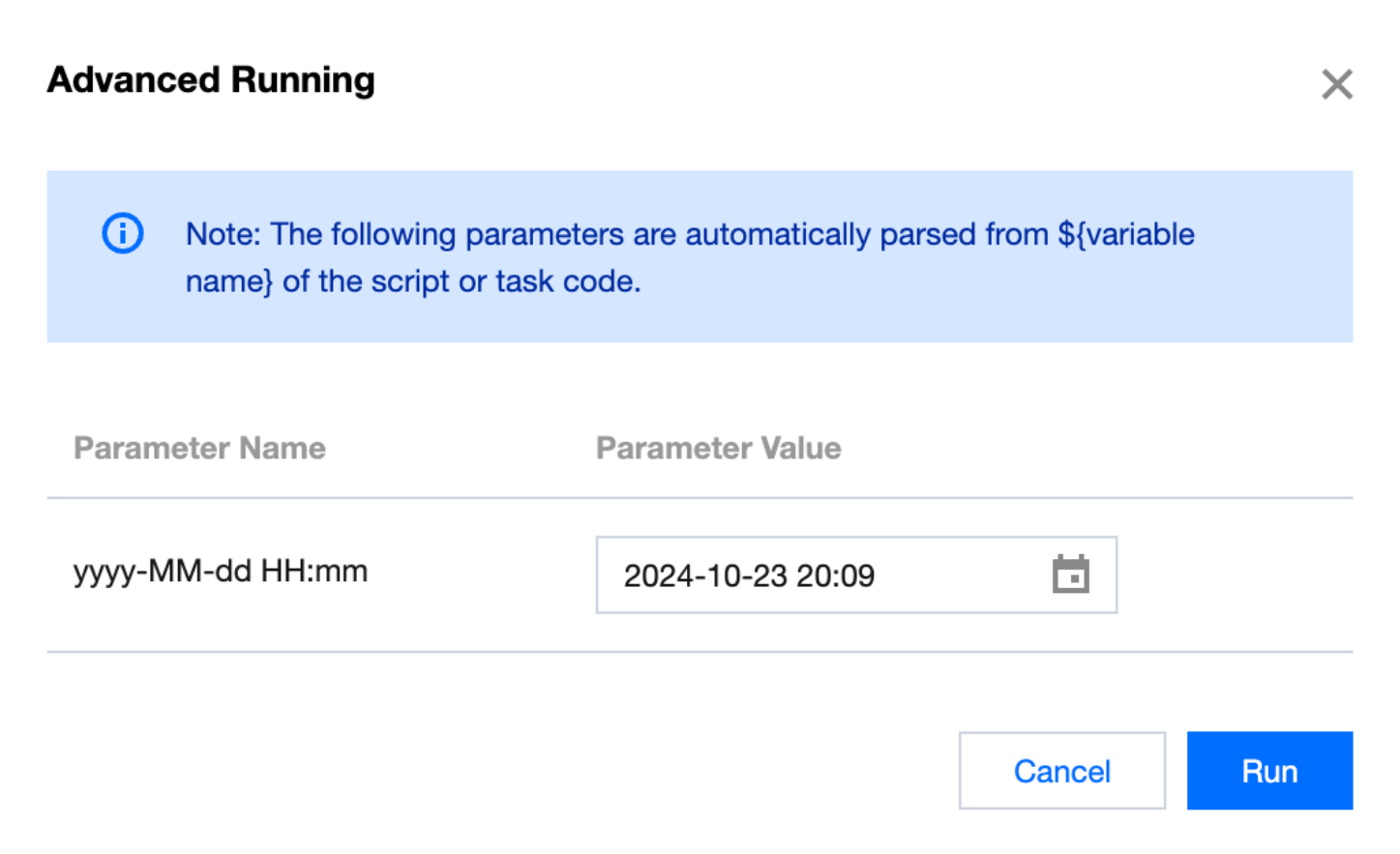 Click the icon to run the current task node with variables. The system will automatically pop up the time parameter and custom parameter used in the code. |