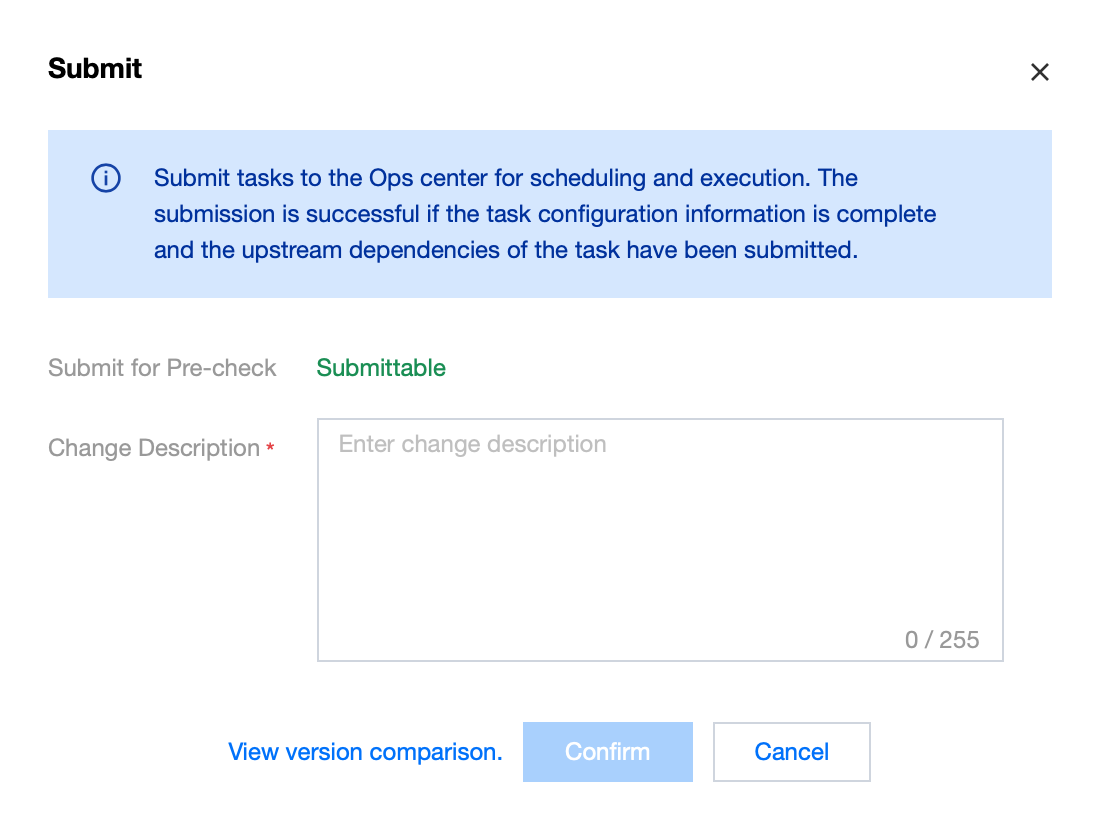 After completing task editing, click the submit button in the top-left corner of the canvas, fill in the change description in the pop-up dialog box, and submit the task (including node basic content, scheduling configuration attributes) to the scheduling system to generate a new version record. Once the task is submitted successfully, you can view or operate the task and corresponding instance in the Ops center.