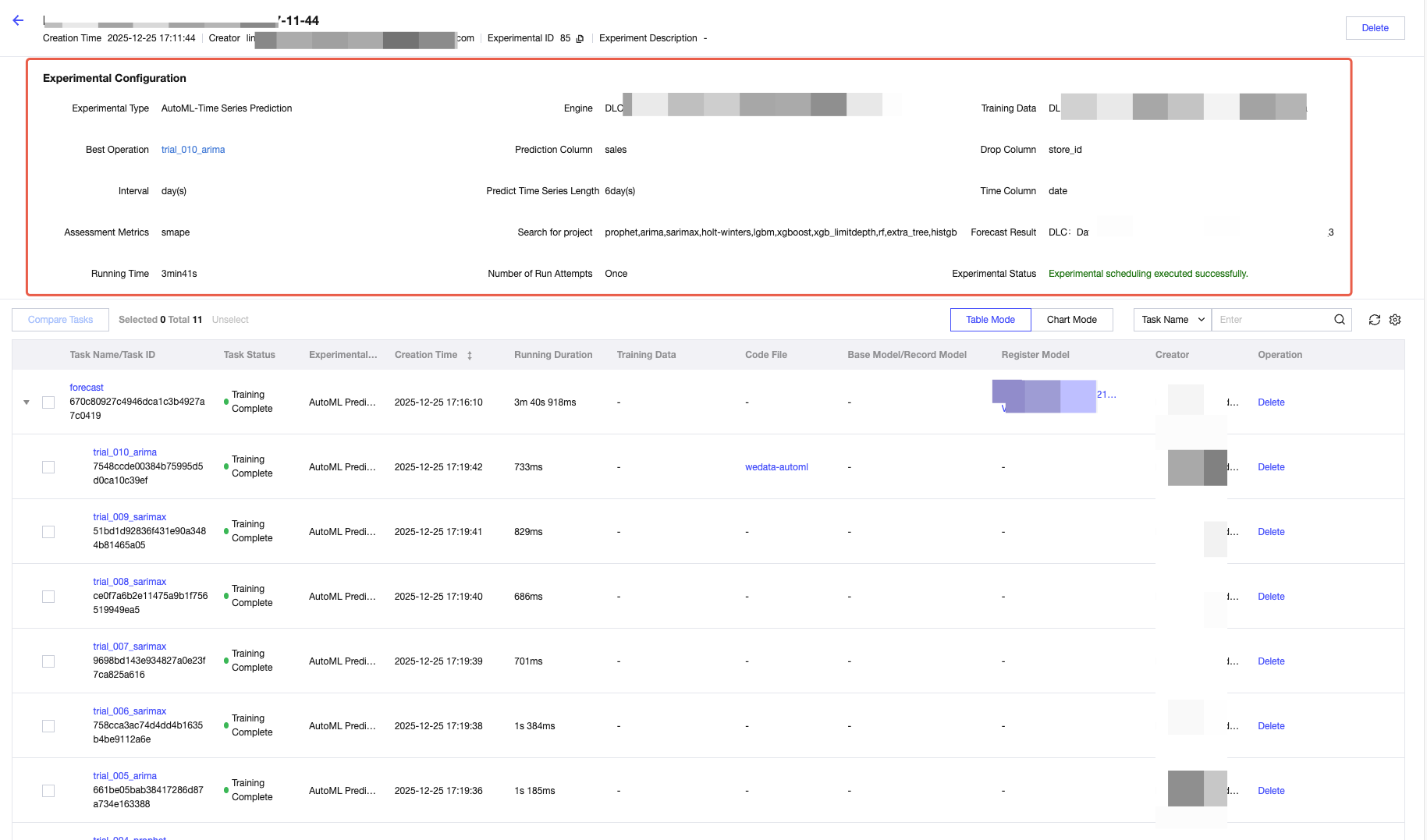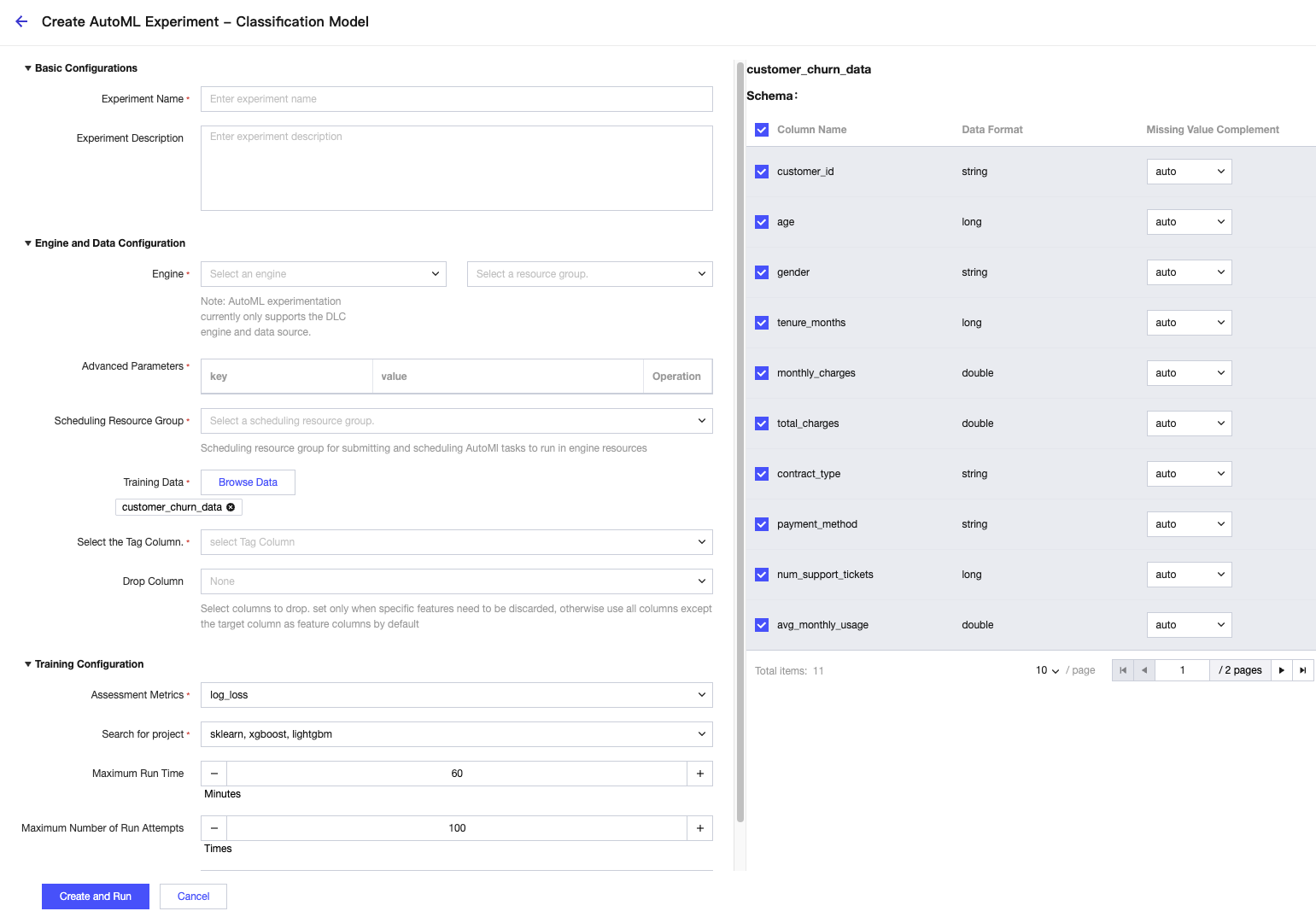 1. Click "Create and Run" at the bottom of the page. The system will automatically generate AutoML experiment code and initiate training.