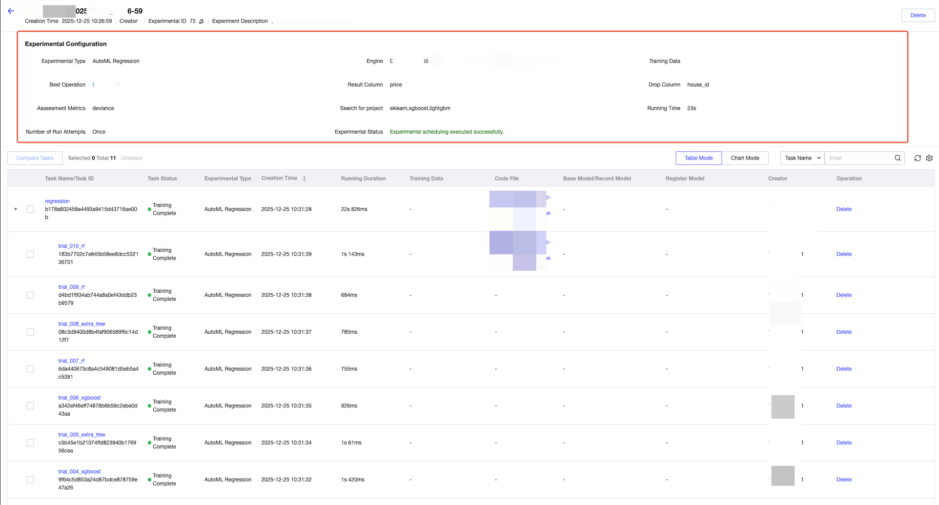 3. View details: Click the experiment name to enter "Task Detail". The "Best Run" field displays the best model. Click to view its parameters, evaluation score, and generated Notebook code.