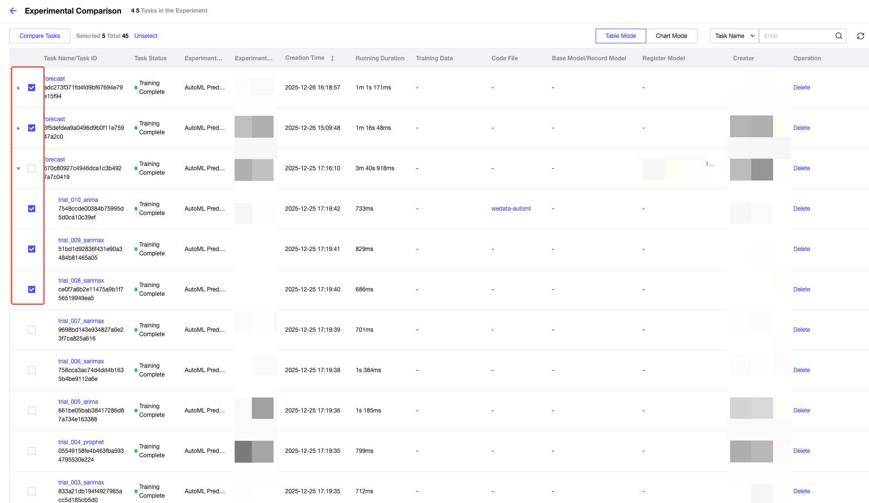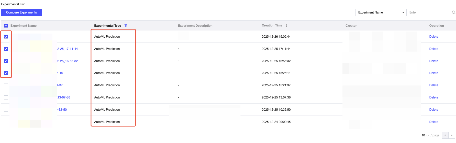1. Experiments of the same type can be compared horizontally. Check the same type of experiments in the experiment list and click the Compare Experiments button.