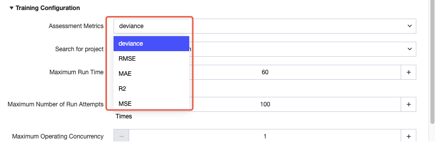 Step 3 Metrics: Default "deviance", selectable "RMSE", "MAE", "R2", "MSE".