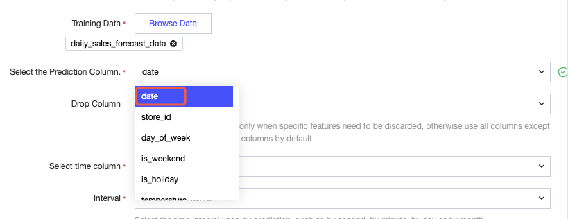 Select prediction column: Single selection "prediction column" (such as "sales").
