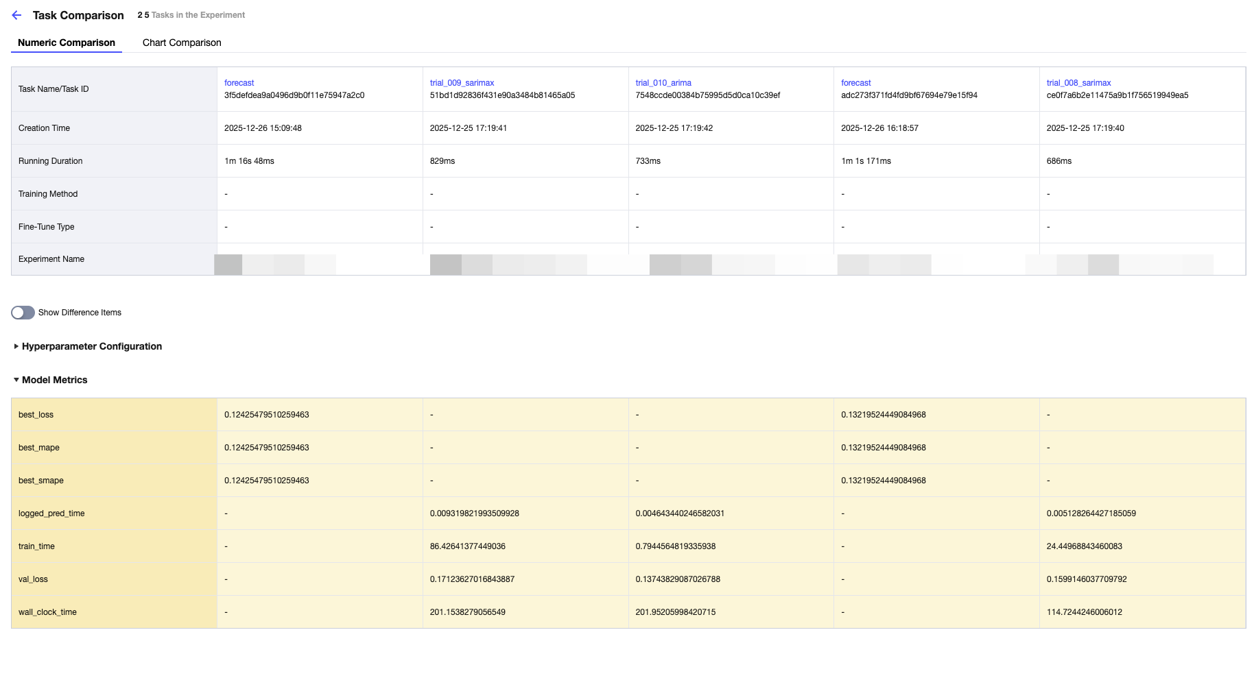 Enter experiment management, monitor the model training process, and compare the model training results.