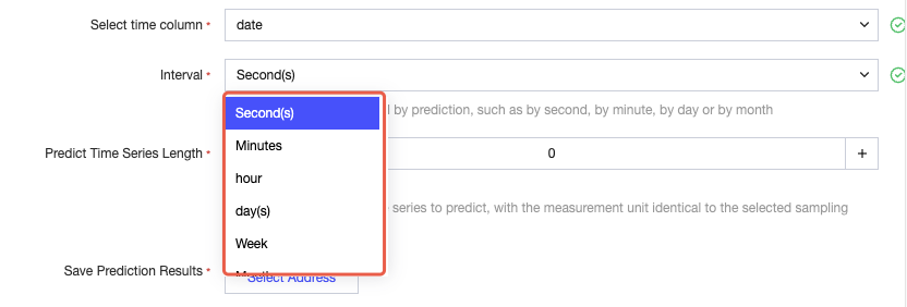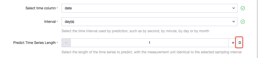 Time interval: Dropdown selection for data time frequency (such as "day", "hour", "month", must match actual data frequency).