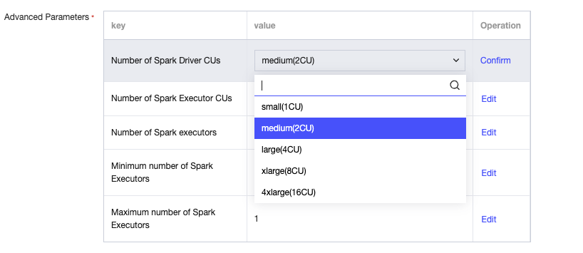 Advanced parameters: Optional. If needed to configure kernel parameters (such as memory, CPU), click "Edit" to fill in, then click Confirm to save.