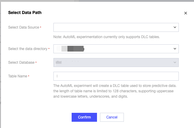 Fill in the table name (limited to 128 characters, supports letters, digits, underscore). The system will automatically create the table to store prediction results.