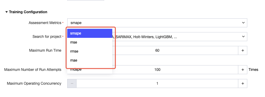 Metrics: Default "smape", selectable "mse", "rmse", "mae", "mdape".