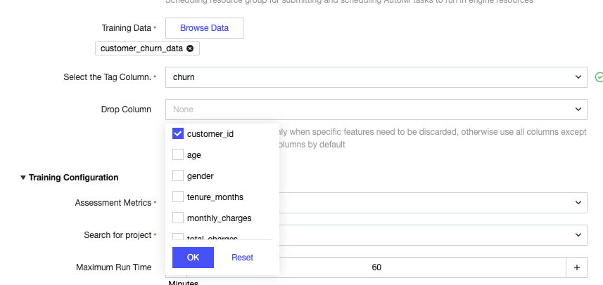 Drop Column: Multiple selection for columns that do not need to be used as features (e.g., "Customer ID", dropped columns will not participate in training).