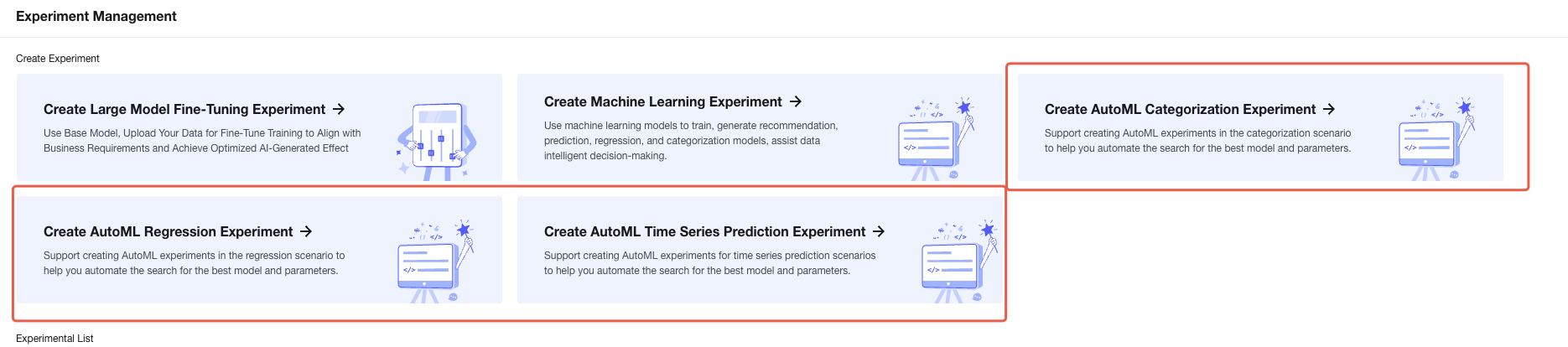 2. At the top of the page, display 3 AutoML experiment portals: create AutoML - categorization experiment, create AutoML - regression experiment, create AutoML - time series prediction experiment. Select the corresponding portal based on business needs.