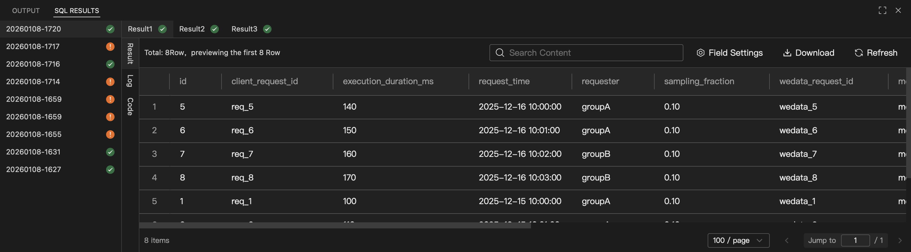 After the SQL execution in Studio is completed, the results are displayed in the Results panel. This panel is used to view: query results, execution logs, executed SQL code. It helps users quickly validate the execution status of the SQL.