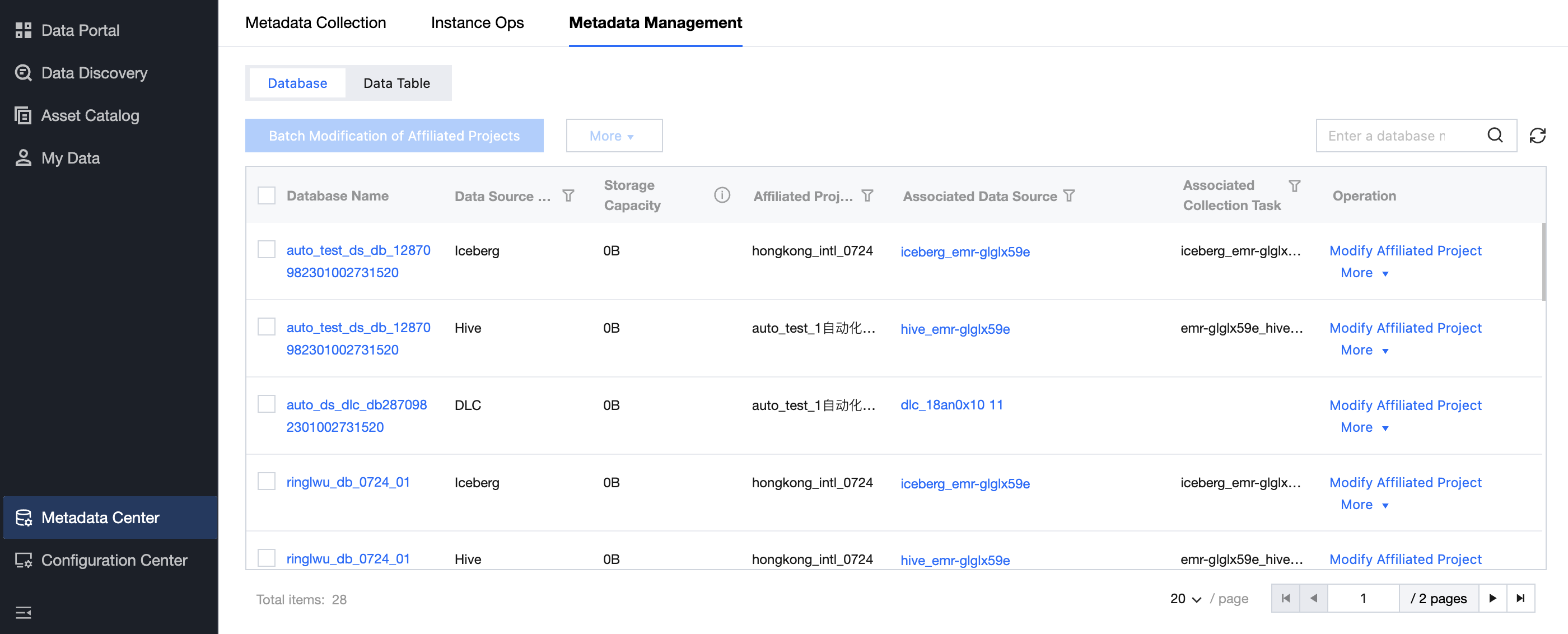 Go to Governance Center > Metadata Center > Metadata Management > Database, this page displays a list of databases collected by full metadata, including database name, data source type, affiliated project, stored amount, associated data source, collection tasks, etc., and supports batch modification of affiliated projects, delete project and other operations.