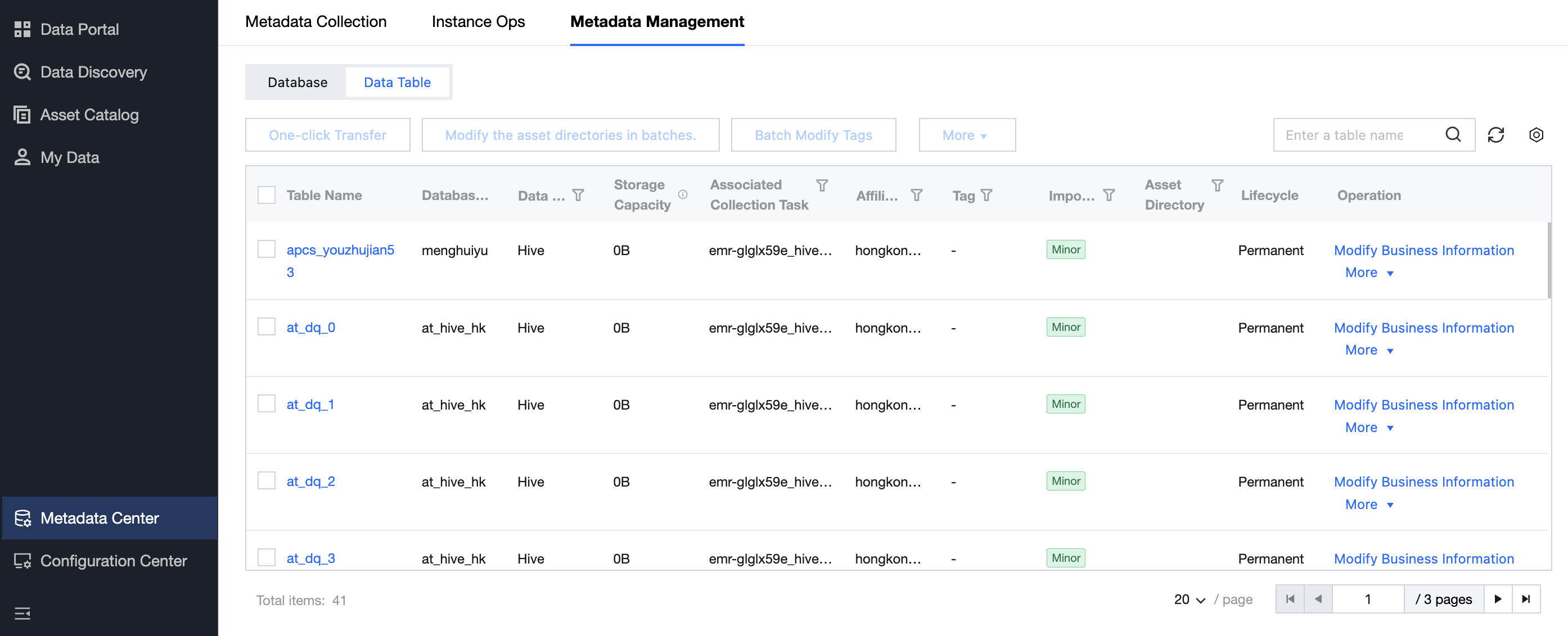Go to Governance Center > Metadata Center > Metadata Management > Data Table, this page displays a list of tables collected by full metadata, including table name, database name, tag, importance level, asset catalog, data source type, data source, associated collection tasks, etc., and supports one-click transfer, batch modification of business properties, and delete operations.