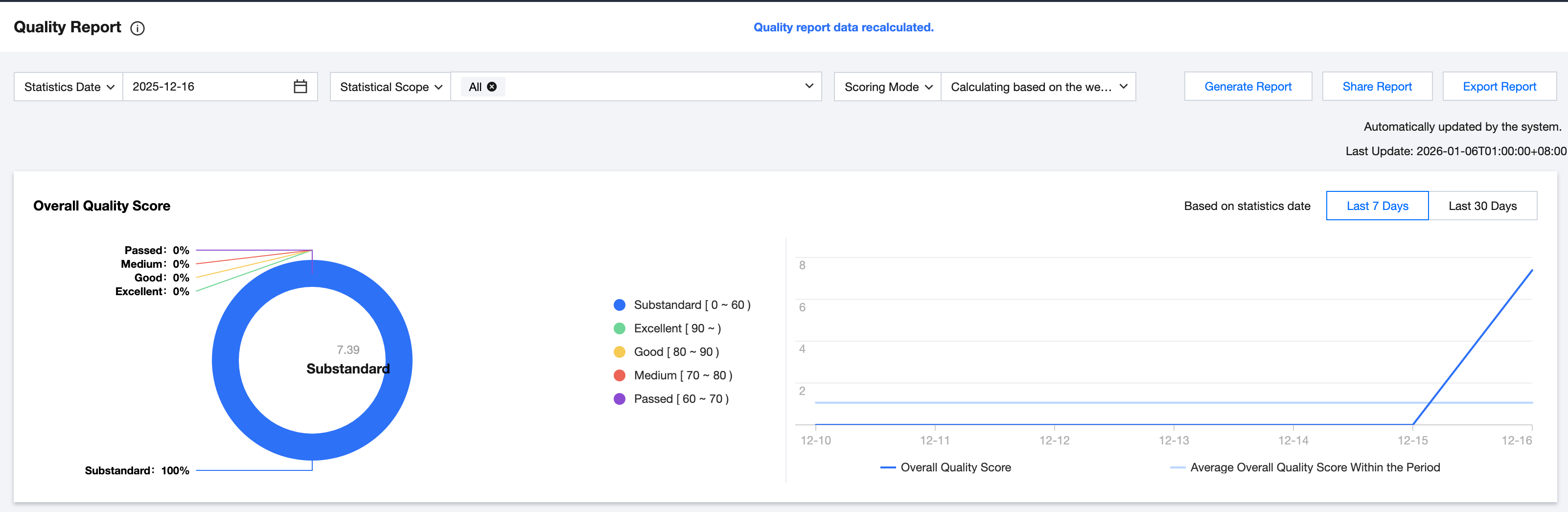 The quality report data supports auto-update by the system (every midnight at 1:00 AM), as well as manual triggering of recalculation after users modify dimension weight. The update method and last update time will be prompted.