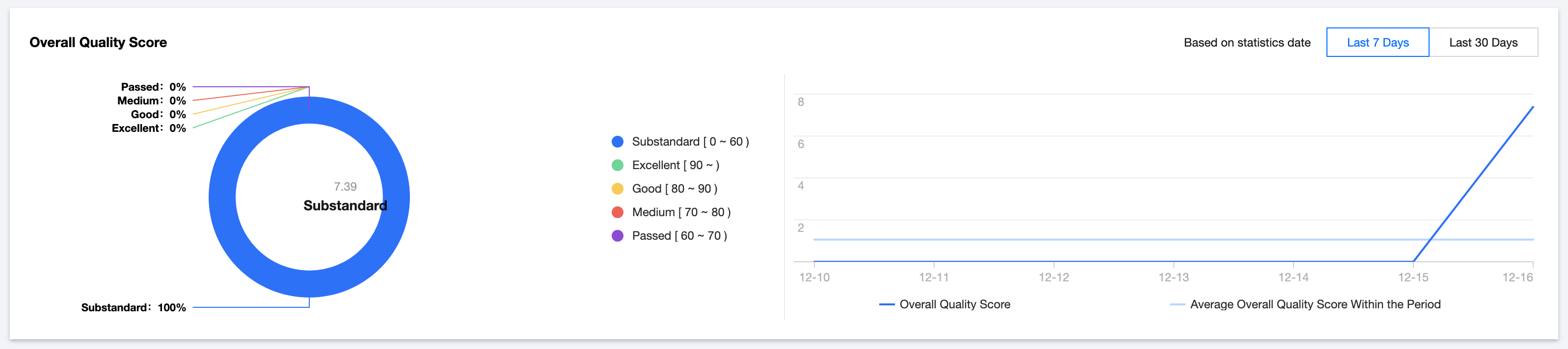 Provides global quality score data, where users can view the trend chart of the last 7 or 30 days and the Average Overall Quality Score Within the Cycle.