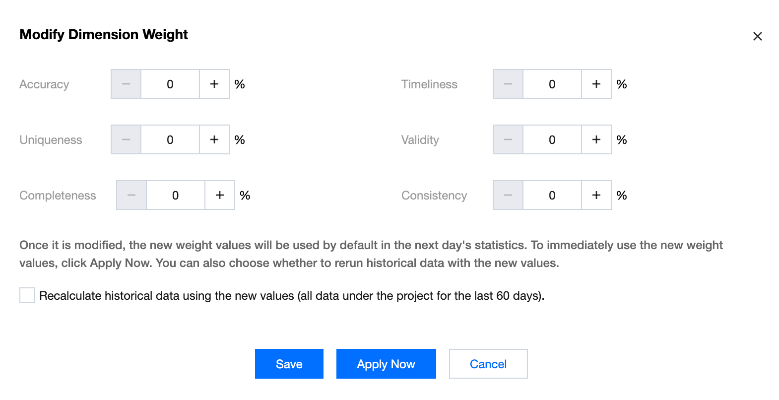 2. Dimension weight is global. When the first two scoring modes (full-dimensional, configured rule dimension) are selected, modification will affect all scores including overall quality score, dimension quality score, library quality score, and table quality score once it takes effect.