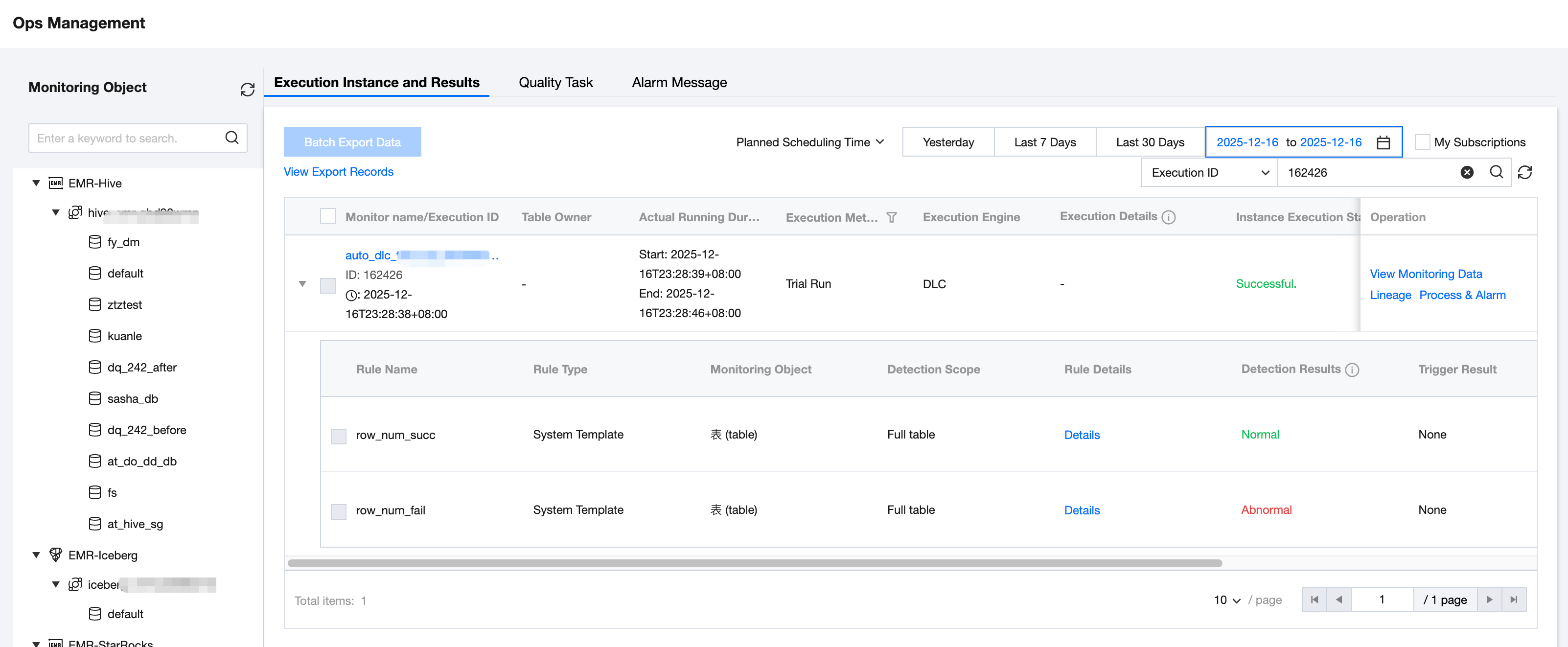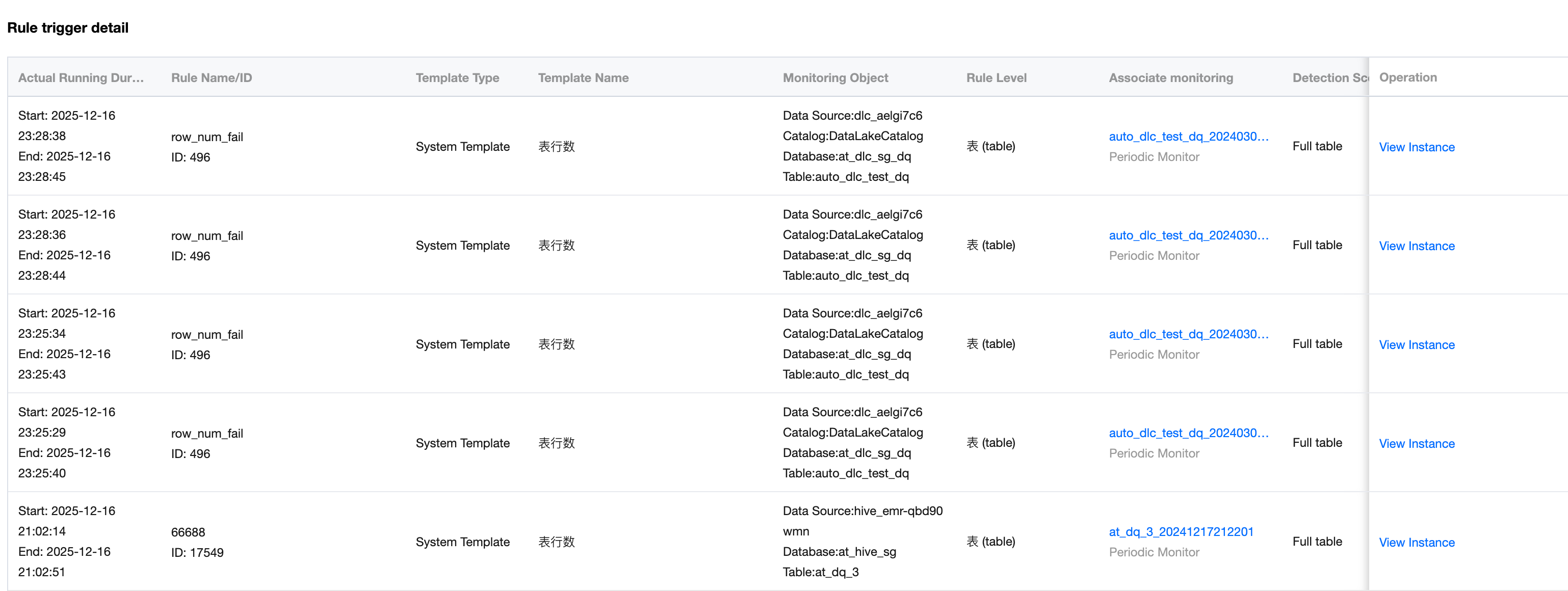 Supports viewing the rule-triggered detailed table in the quality report (including only instances where the rule "Detection results abnormal" is triggered), which summarizes when/which data table/corresponding quality monitoring and rule were triggered ("triggered" means it actually meets the configured rule conditions):