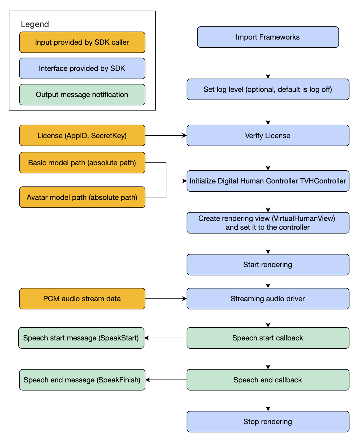 // Place the general model and avatar model under the Documents directory in the sandbox firstNSArray *paths = NSSearchPathForDirectoriesInDomains(NSDocumentDirectory, NSUserDomainMask, YES);NSString *documentsPath = [paths firstObject];NSString* common_model = [NSString stringWithFormat:@"%@/common_model", documentsPath];NSString* human_model = [NSString stringWithFormat:@"%@/human_yunxi_540p_v3", documentsPath];// Initialize the controllerself.controller = [[TVHController alloc] initWithCommonModelPath:common_model humanModelPath:human_model];self.controller.delegate = self;// Start rendering[self.controller start];