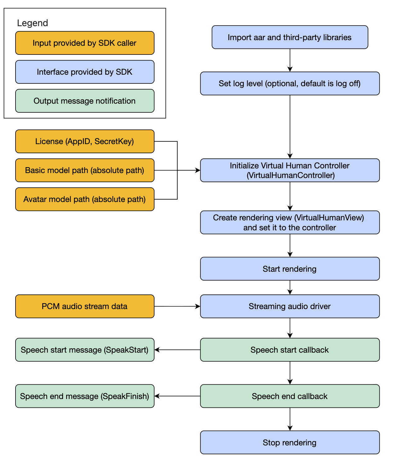 VirtualHumanParam vhParam = new VirtualHumanParam();// Local model pathvhParam.humanModelPath = "/data/user/0/com.tencent.virtualhuman_2d_demo/files/test_model/human_model";// Local model pathvhParam.commonModelPath = "/data/user/0/com.tencent.virtualhuman_2d_demo/files/test_model/common_model";vhParam.appId = "License appId";vhParam.secretKey = "License secretKey";vhParam.deviceName = "Device tag, use nameplate info";// error callback functionvhParam.errorCallback = (code, message) -> {Log.d(TAG, "Code: " + code + ", Message: " + message);};// event callback functionvhParam.eventCallback = (code, message) -> {Log.d(TAG, "Code: " + code + ", Message: " + message);};controller = new VirtualHumanController(this, vhParam);int ret = controller.initHuman();if (ret == 0) {controller.setRenderView(virtualHumanView); // set rendering viewcontroller.startHuman();// Start rendering} else {Log.i(TAG, "init fail=" + ret);}