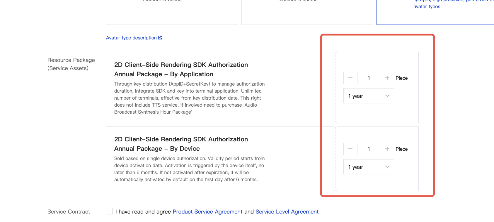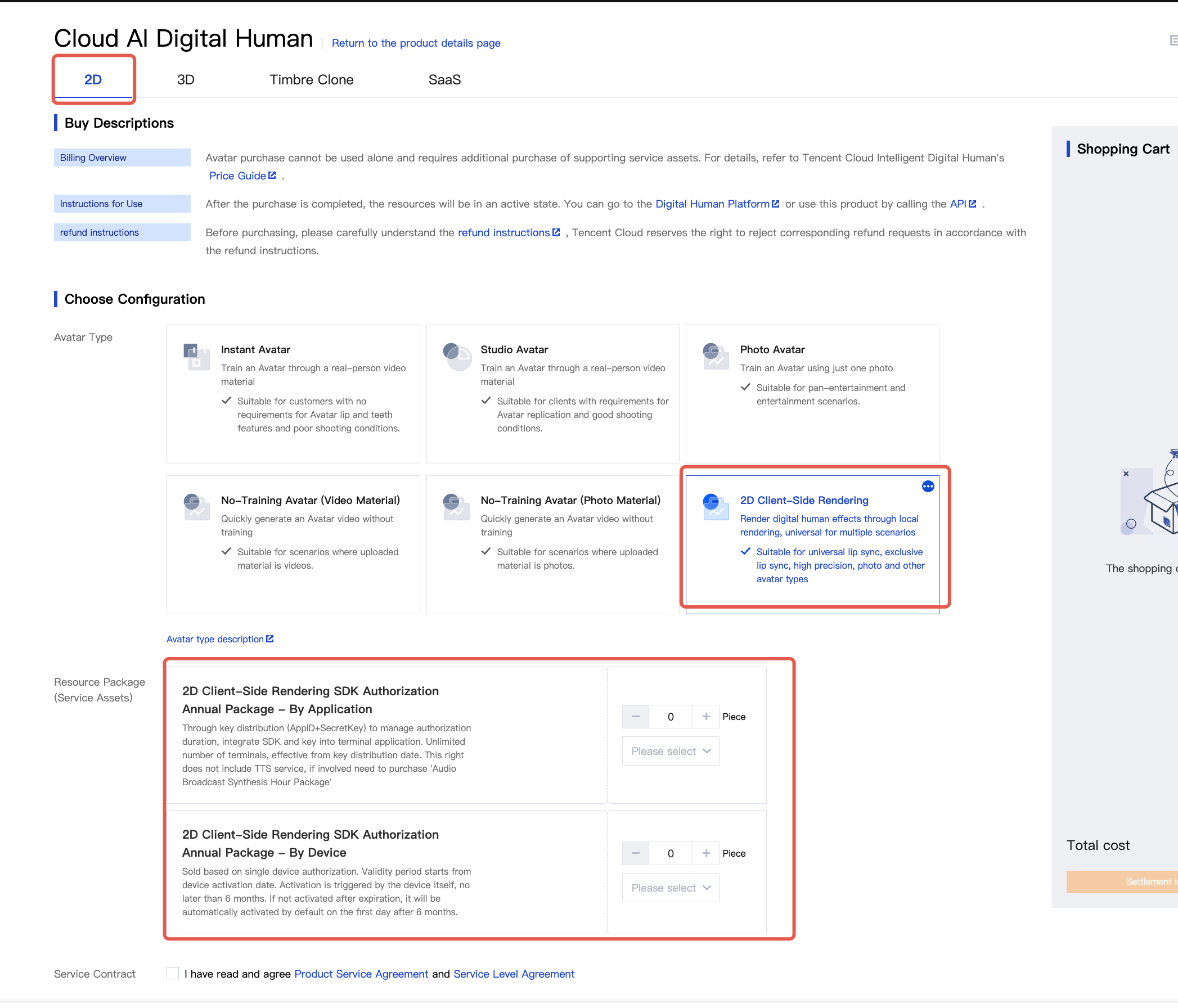 1. Currently available in the 2D avatar interface > select configuration 2D endpoint rendering, purchase page address: proceed to purchase. 2. Locate the "2D Rendering SDK Annual License" resource pack, choose appropriate authorization mode, then click Purchase Now, as shown below: