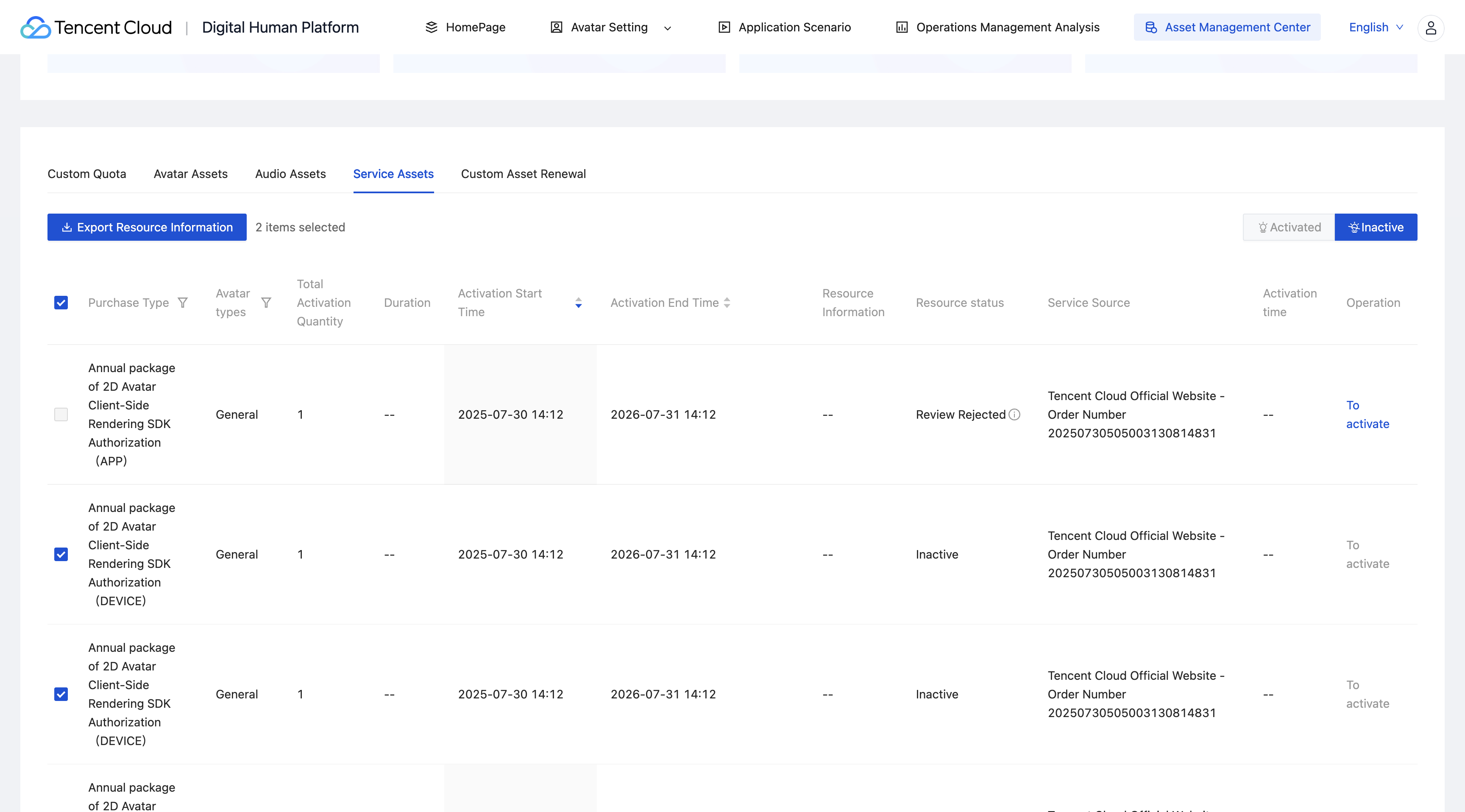 1. Follow the "place orders on the official website" guide. After completing the order, log in to the digital human platform and locate the corresponding order information by following "Management Center > Service Asset > Inactive", as shown below: 2. Select different authorization modes, refer to the following steps: