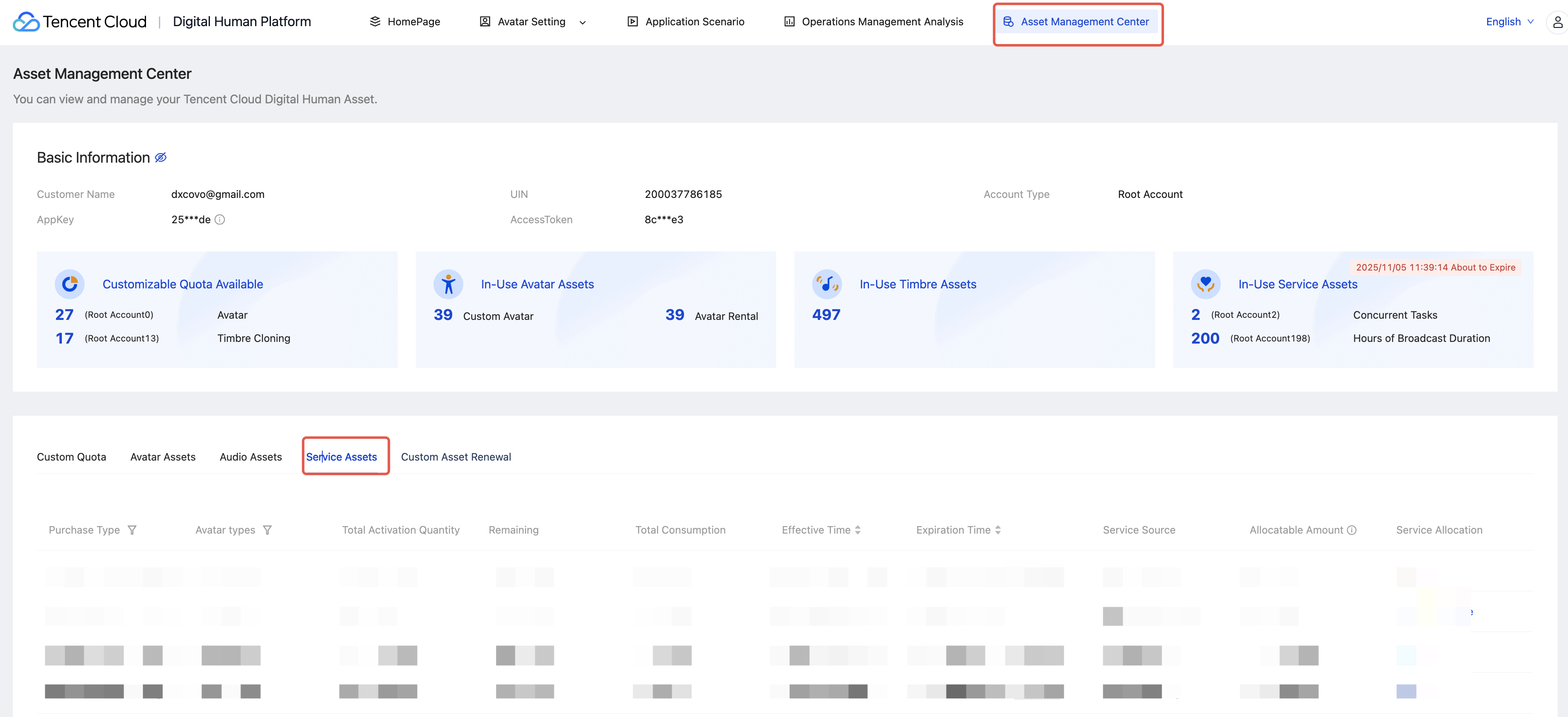 After the review is passed (normally processed within 1 business day), the platform will auto-generate key information. Users can manually copy and download the key info. Path: Management Center > Service Asset > Activated. As shown below: