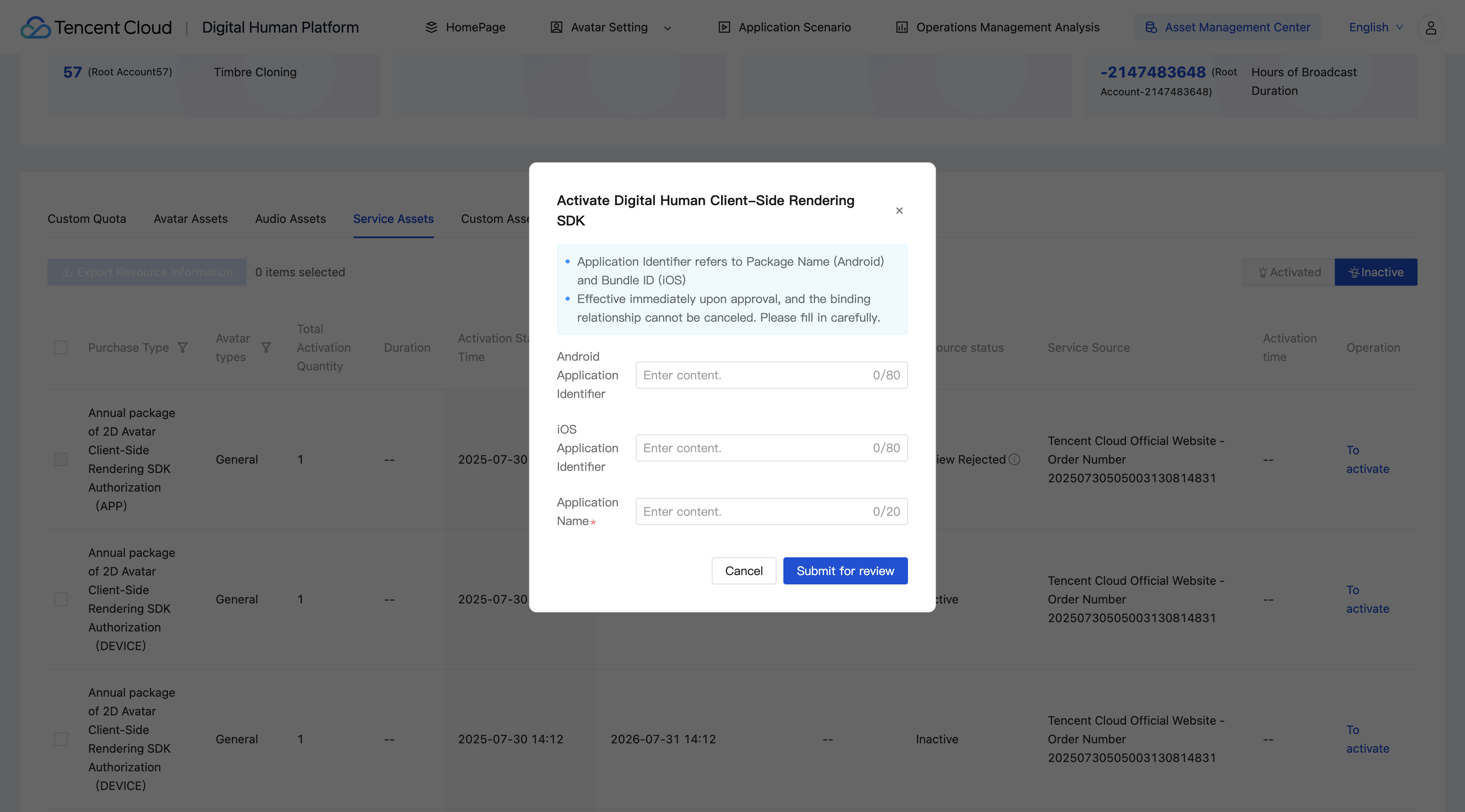 Self-service procurement and customization of 2D small sample digital human: Complete avatar customization via custom asset management. Retrieve custom avatar model package: After customization completion, send email (txc_avatar@tencent.com) to obtain the avatar model package offline.