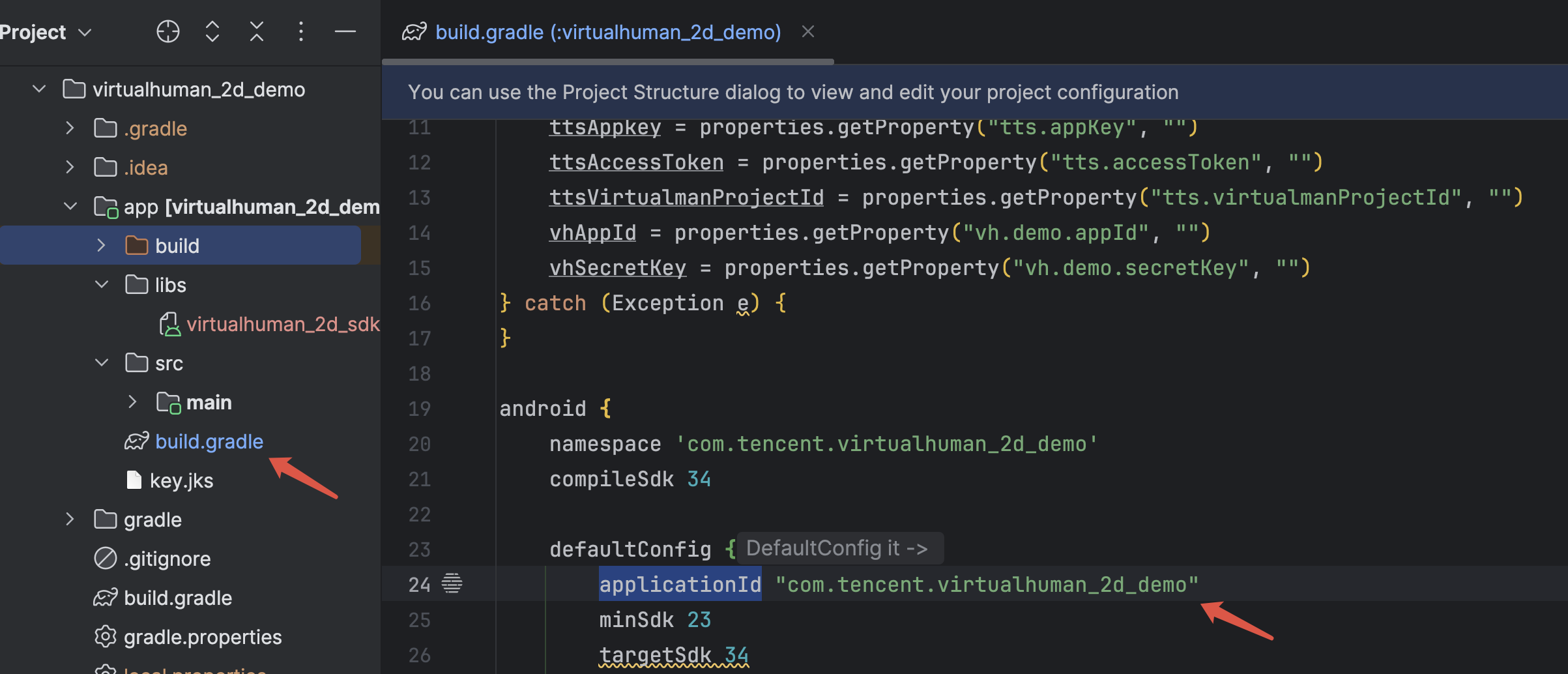 Application ID for Android devices can be found in the build.gradle file in the project directory, as shown below: