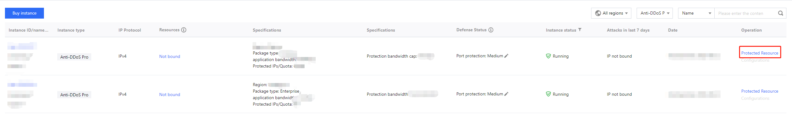 1. Log in to the new Anti-DDoS console and click Anti-DDoS Instances on the left sidebar. 2. On the Anti-DDoS Instances page, select a target Anti-DDoS Pro instance and click Protected Resource in the Operation column.